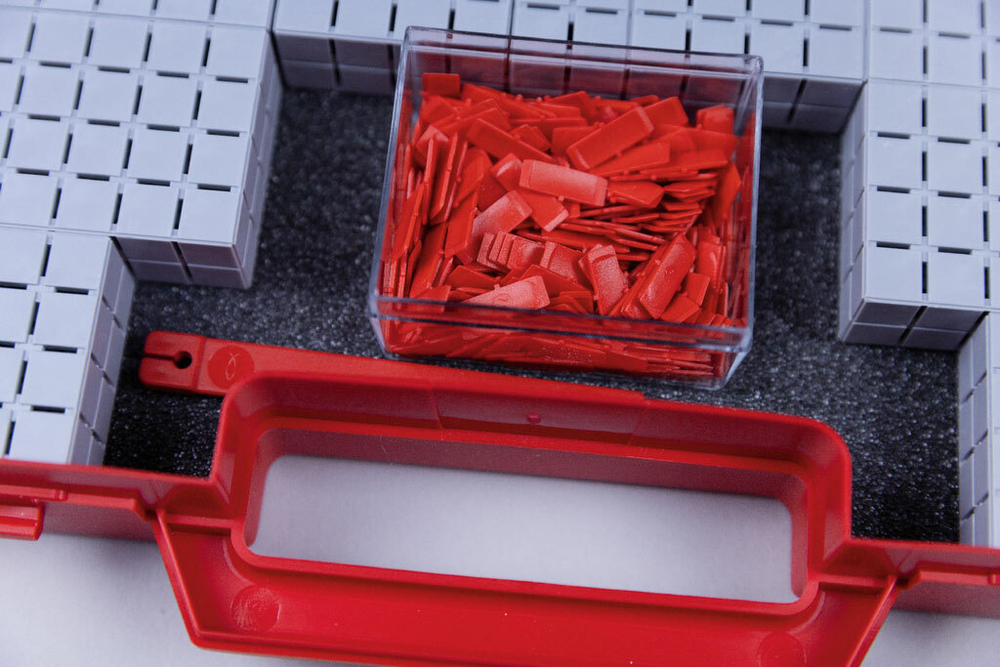 Конструктор содержит прямоугольные и квадратные строительные блоки с разным основанием и высотой для построения прямоугольных тел. С вводным буклетом.