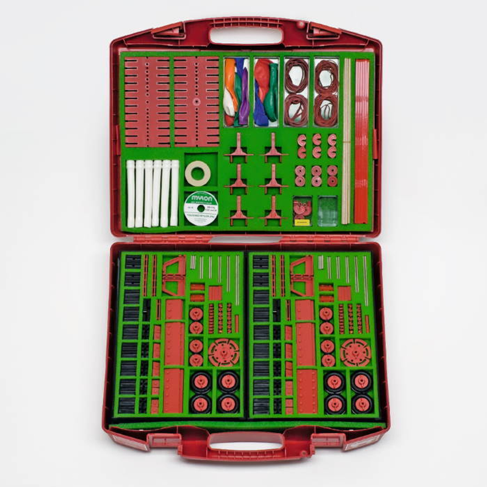 В комплект лабораторного оборудования входят 6 технических конструкторов, состоящих из готовых элементов конструкций. В крышке чемодана находятся основания для сборки моделей и вспомогательные элементы для различных движителей и приводов.