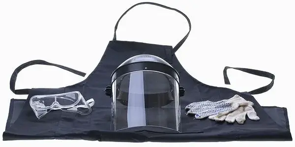В комплект входят защитные очки, фартук прорезиненный, перчатки прорезиненные, маска-щиток.