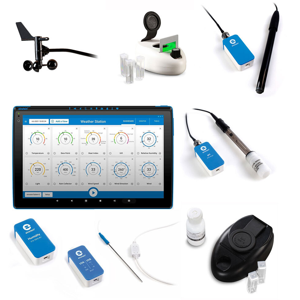 Комплект из цифровой лаборатории Einstein и внешних датчиков для проведения практических исследований окружающей среды.