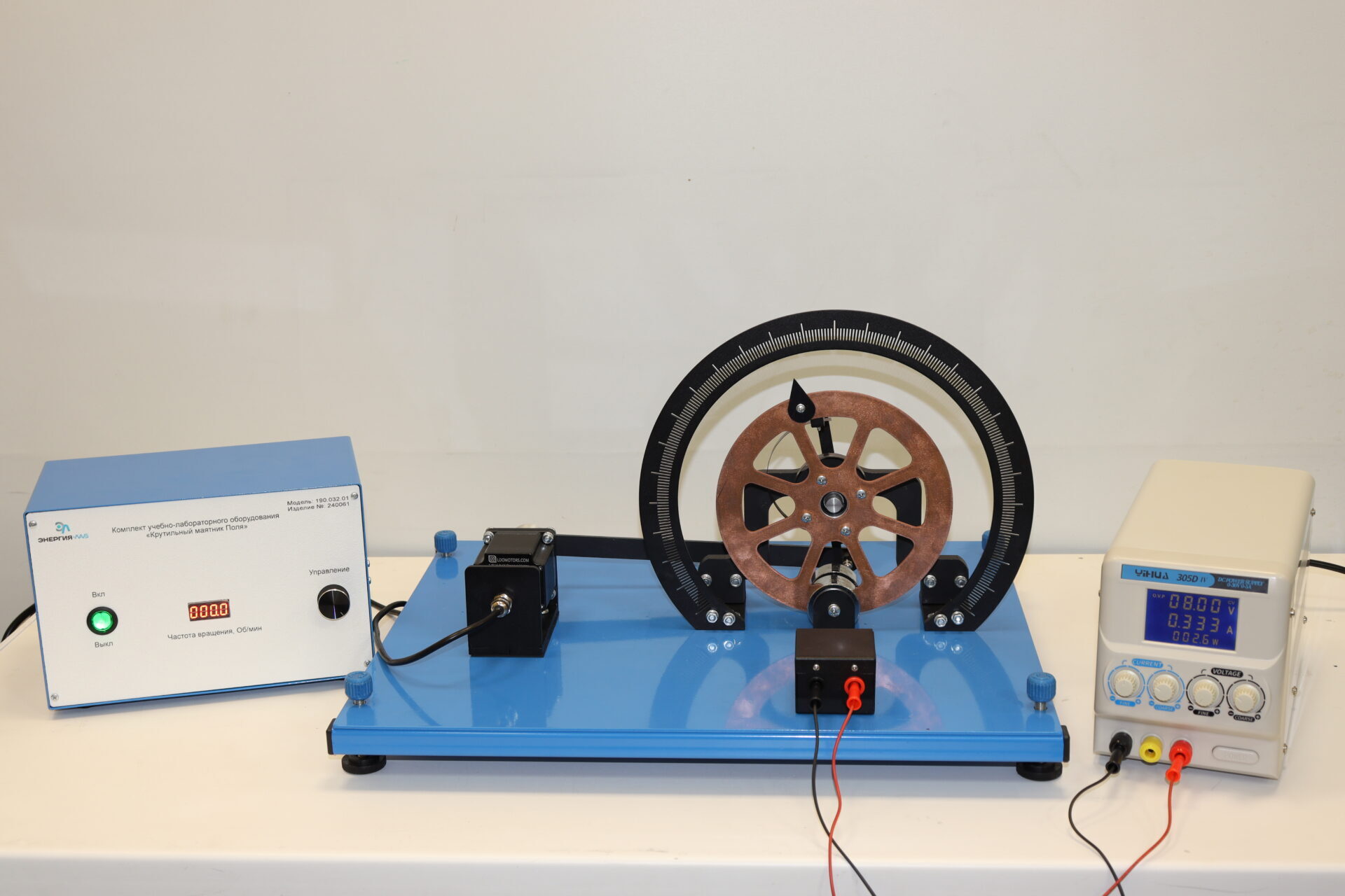 Оборудование конструктивно представляет собой вертикально установленное на неподвижном основании колесо Поля с возвратной пружиной. Крутильные колебания колеса возбуждаются с помощью электродвигателя постоянного тока с регулируемой скоростью. Изменением скорости вращения двигателя изменяется частота колебаний крутильного маятника. Период колебаний измеряется с помощью механического секундомера.