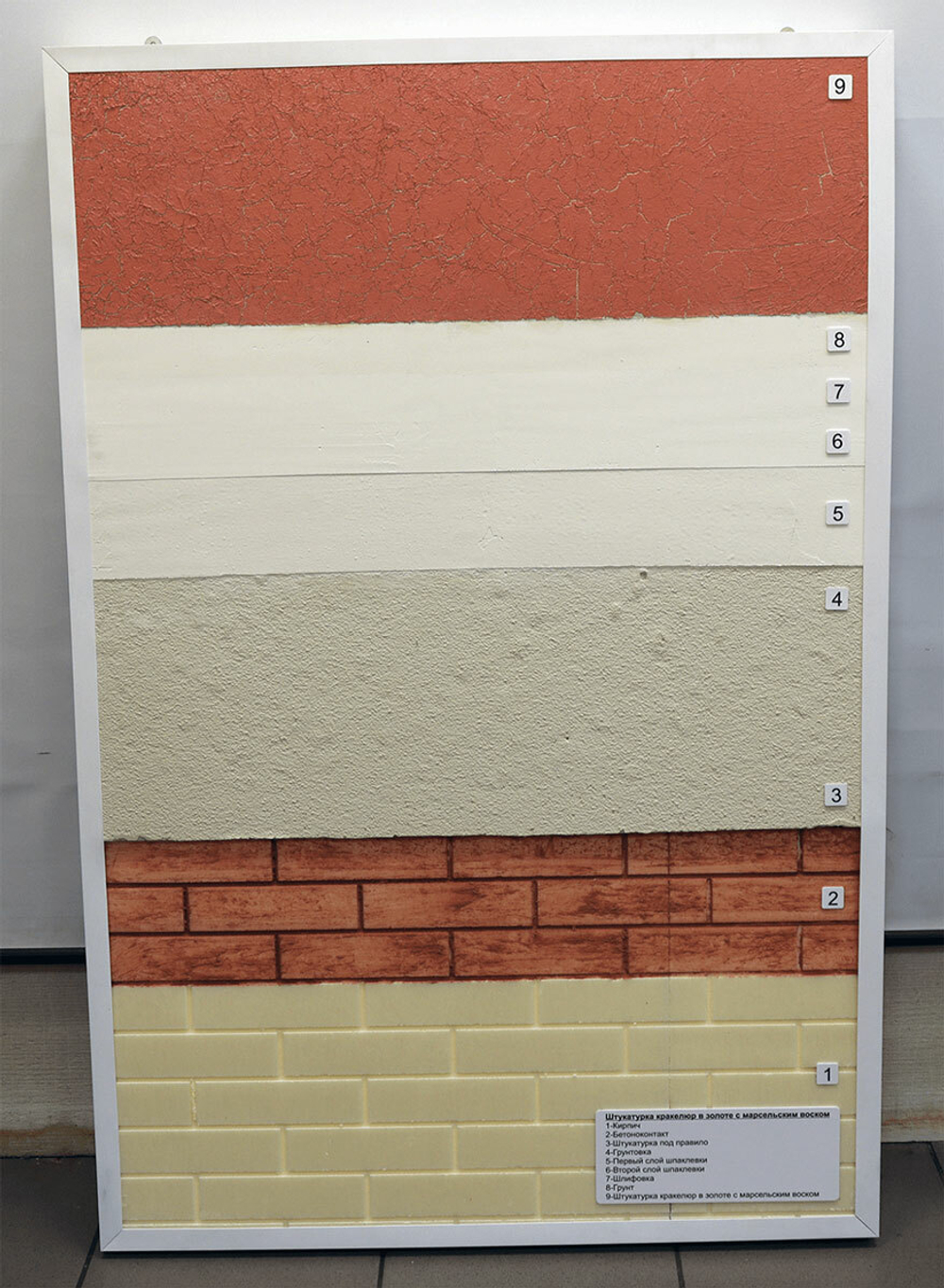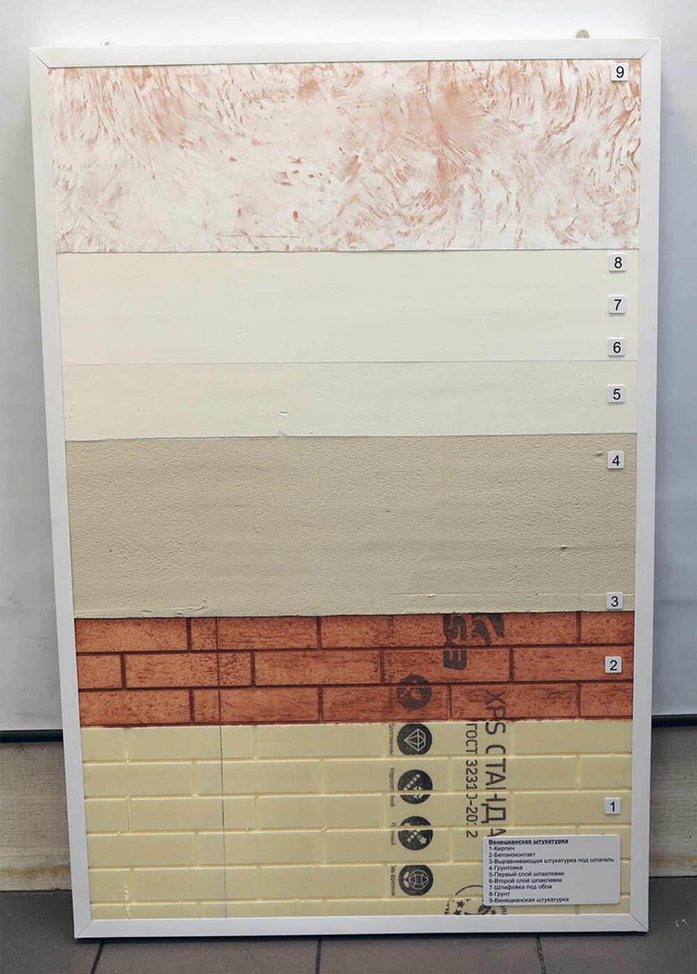 - Демонстрационный набор «Различные варианты штукатурных работ для внутренней и наружной отделки», предназначен для демонстрации образцов штукатурки на водной основе для наружной отделки. В состав набора входят образцы штукатурки на водной основе для наружной отделки, отделанные и окрашенные, в виде насечек, мраморной крошки, нанесенные и разбрызганные и варианты отделки для фасадов. Образец штукатурки нанесен на деревянную табличку, закрепленную на композитной панели.
