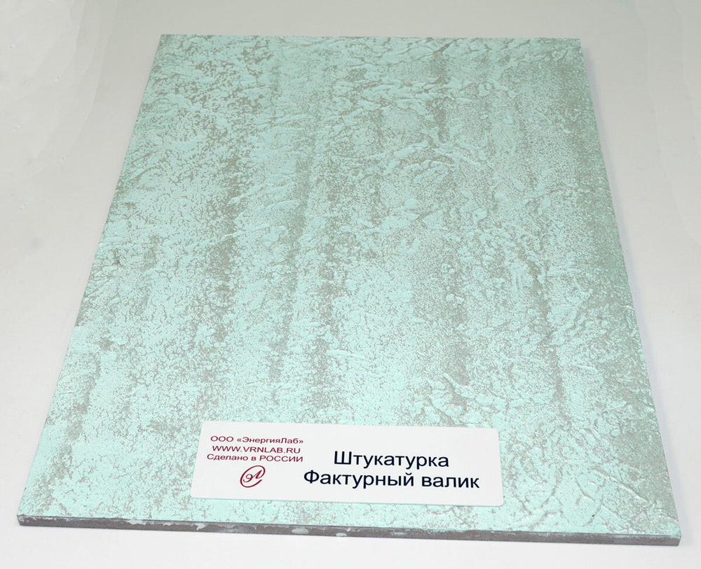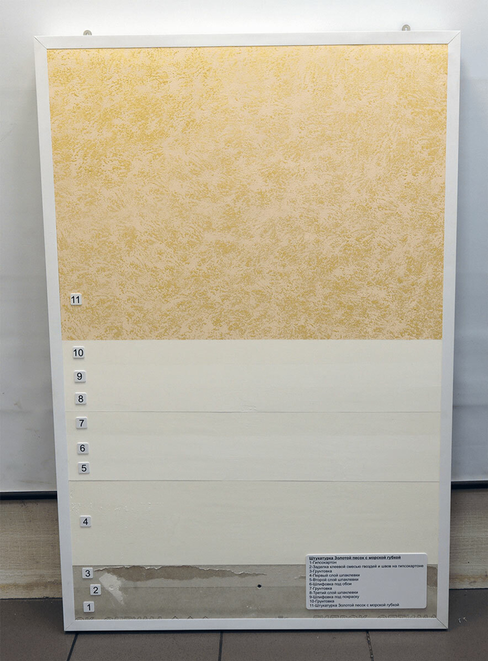 - Образец штукатурки нанесен на деревянную табличку, закрепленную на композитной панели.