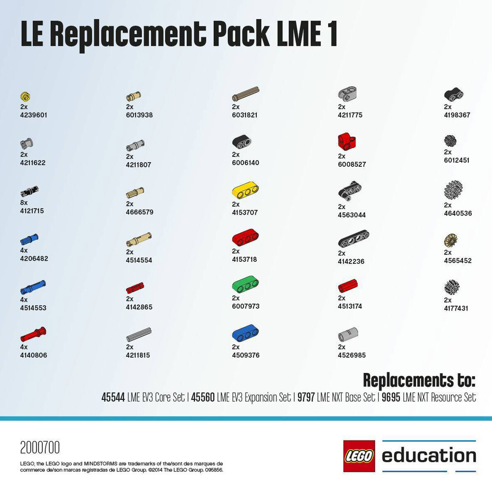 Этот набор содержит запасные детали для Базового набора LME EV3 (45544), Ресурсного набора LME EV3 (45560), Базового набора LME NXT (9797) и Ресурсного набора LME NXT (9695).
