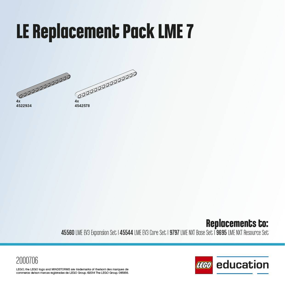 Комплект запасных частей для наборов LEGO Education. Предназначен для использования со следующими наборами: Базовый набор MINDSTORMS EV3 45544; Ресурсный набор MINDSTORMS Education EV3 45560; ПервоРобот NXT Базовый набор 9797; Набор средний ресурсный LEGO MINDSTORMS 9695.