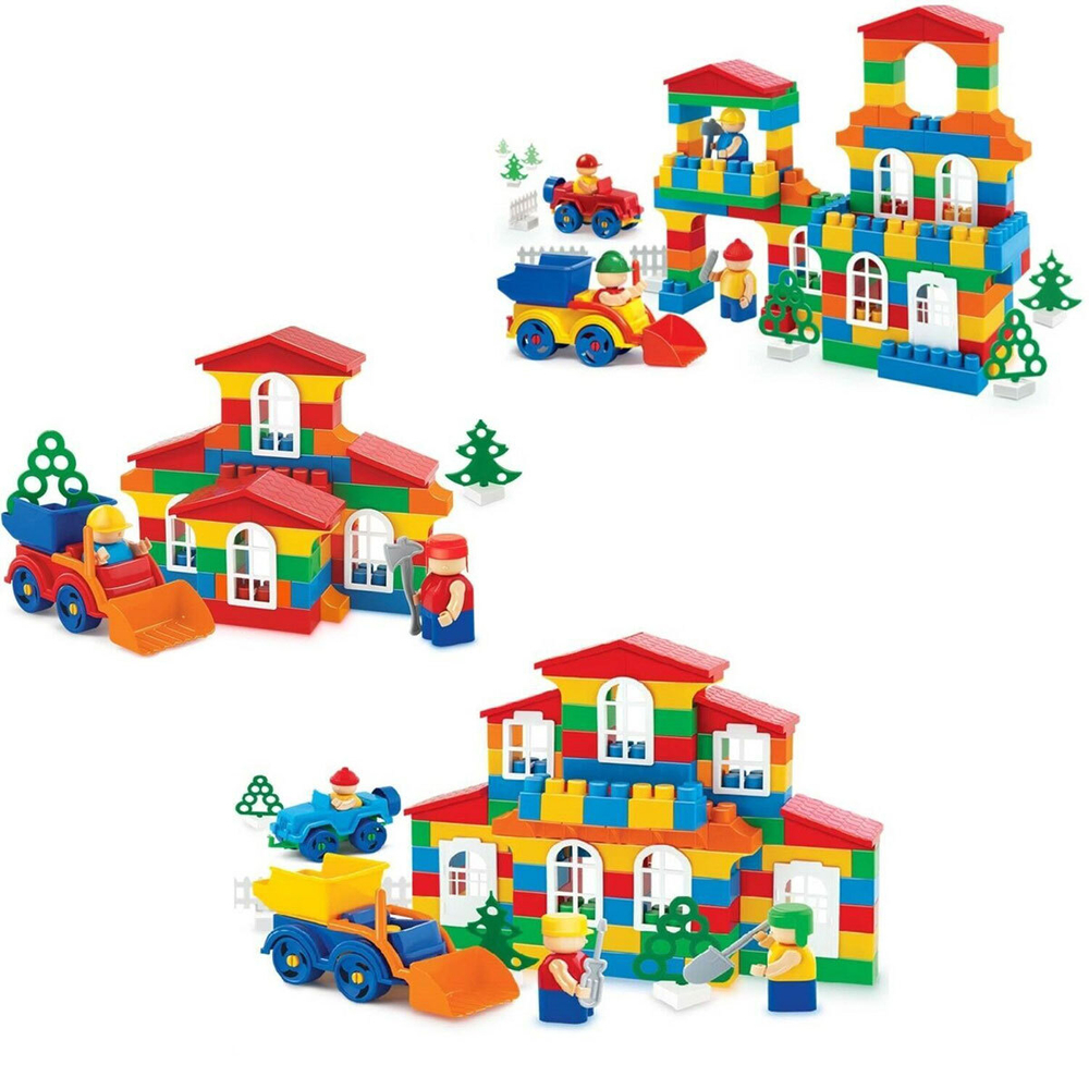 В комплект входят: кубики различного размера, фигурки человечков, инструменты, сборные машинки, элементы декора (заборы, деревья, окна, двери, крыши).