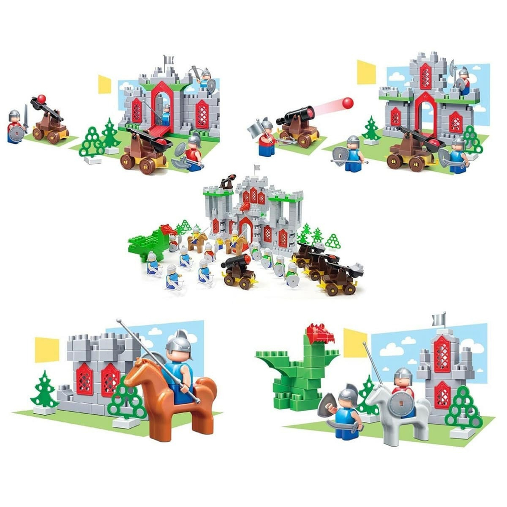 В комплект входят: кубики разных размеров и цветов, декоративные элементы, такие как деревья, крыши, окна, ворота, флаги, фигурки рыцарей, оружие и щиты, фигурки лошадей, сборные пушки и катапульты, ядра для стрельбы, фигура дракона.