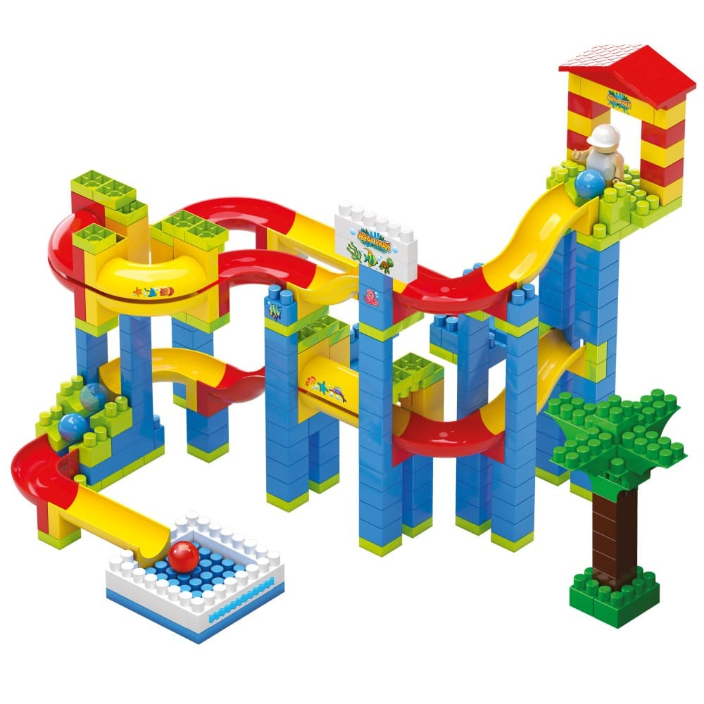 В комплект входят: строительные блоки разных размеров и цветов, крупные шарики, желоба для постройки горки, руководство по сборке.