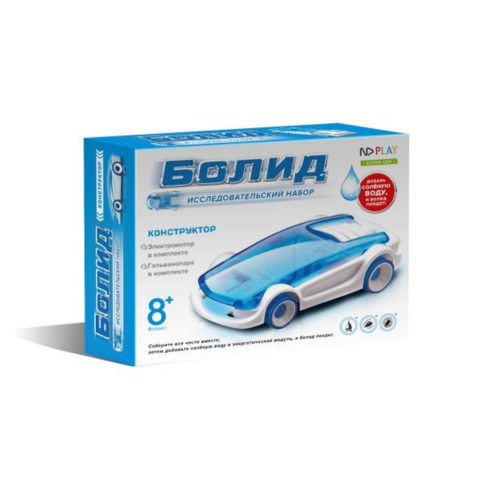 Скоростной болид на энергии солёной воды несомненно обрадует каждого ребенка! Робот ездит на простой соленой воде. Игрушка наглядно демонстрирует возможность получения энергии из соленой воды. Игрушка приводится в движение при помощи специального топливного элемента на растворе соли. Все что потребуется – это легко и просто собрать модель из конструктора и капнуть немного соленой воды в специальный отсек.
