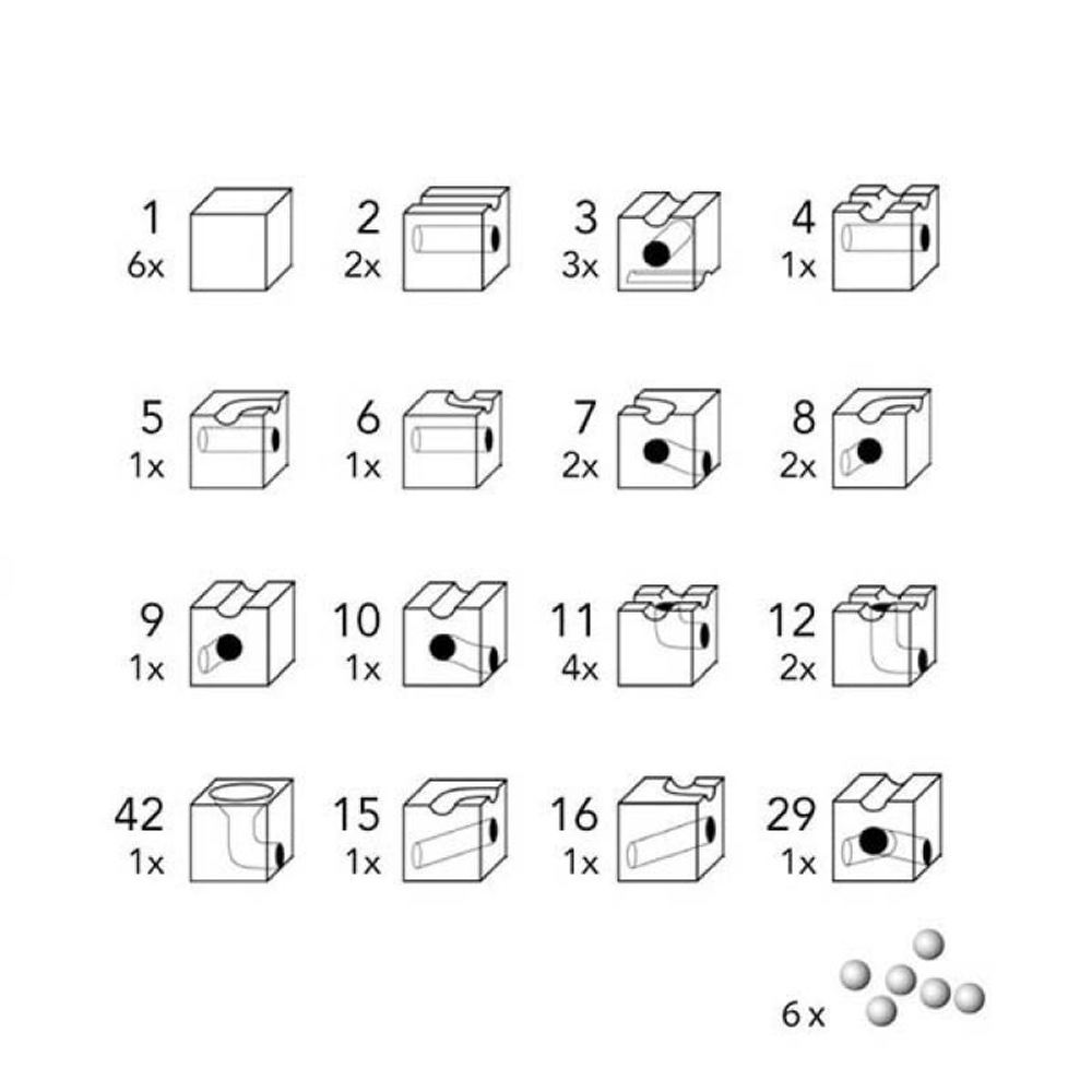 В комплекте идёт методическое пособие "Cuboro – думай креативно". Cuboro XXL включает в себя 30 кубических элементов с гранями по 10 сантиметров, оснащенных воронками, каналами, поворотами и туннелями, а также набор включает 6 шариков.