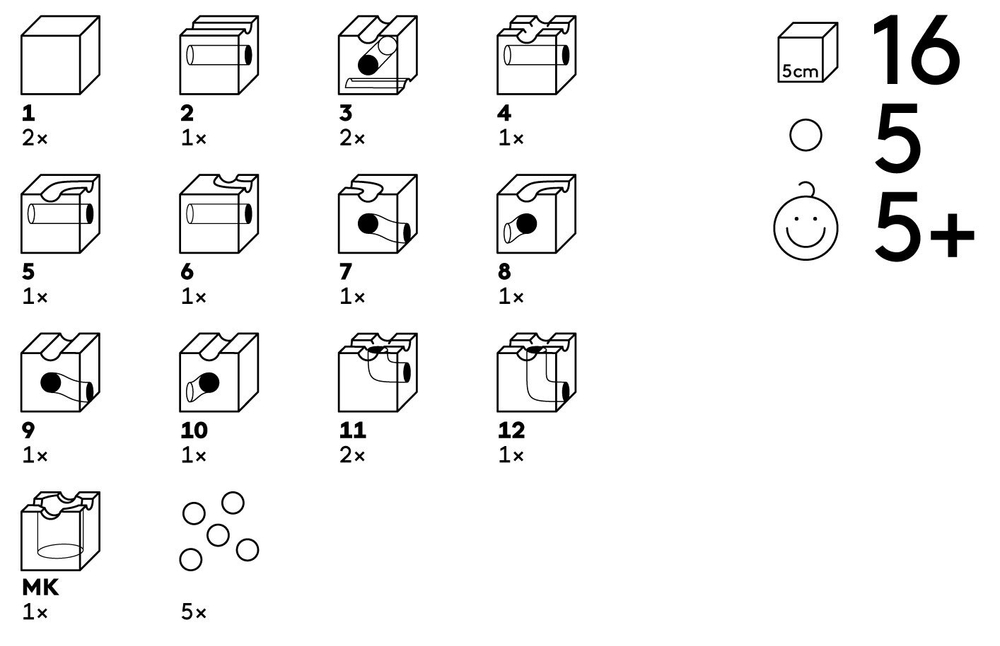 Внешний вид кубиков набора CUBORO STANDARD 16 кажется на первый взгляд максимально простым. Но именно эта простота создает их «личность». У каждого кубика набора CUBORO есть имя – это его номер. На упаковке всех наборов CUBORO или внутри вы можете найти схематичное изображение кубиков с их индивидуальными туннелями и желобами, которые придают каждому из них собственную индивидуальность. Вся серия наборов STANDARD имеют в составе одинаковые кубики по своей функциональности, различаясь только количеством.