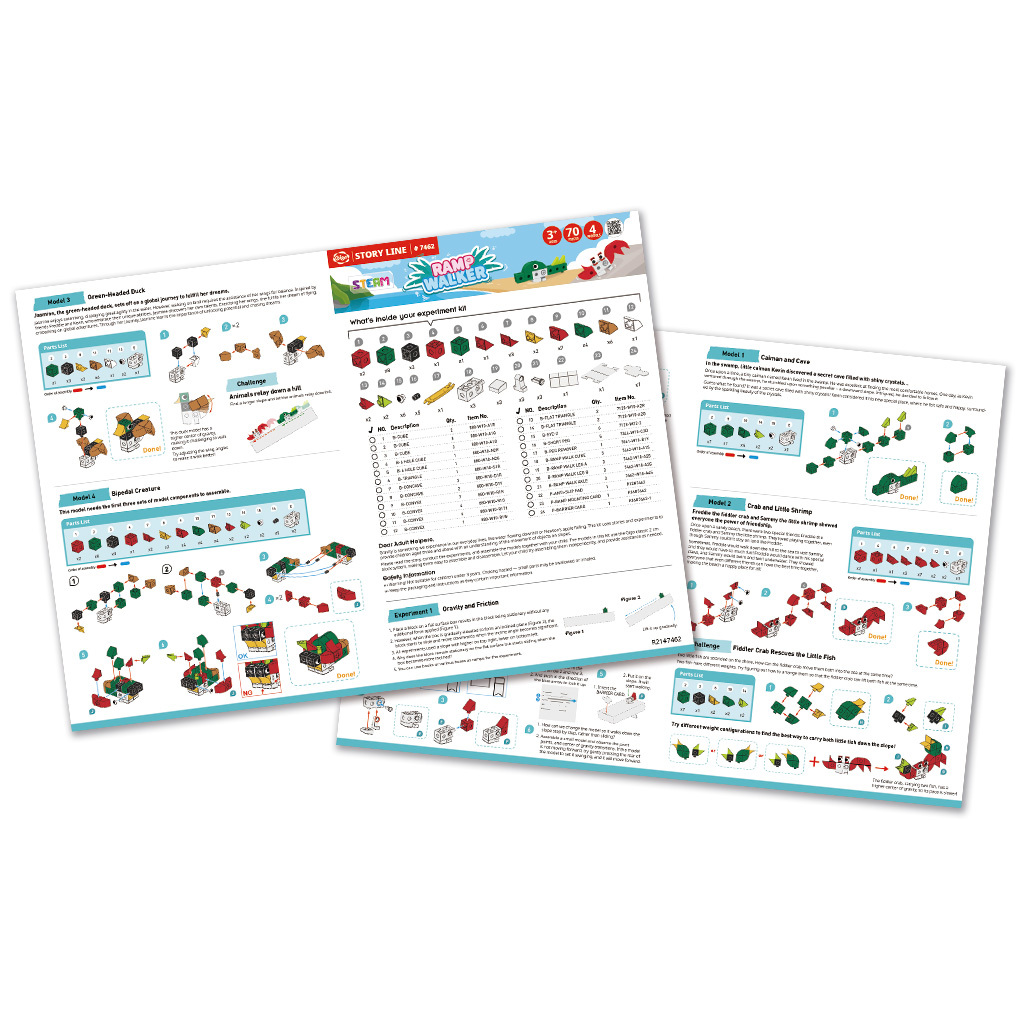 Фигурки собираются на базе специальной конструкции, позволяющей им «шагать» по наклонной плоскости. Благодаря правильно распределённому центру тяжести и точкам опоры, они движутся без моторов и батареек. Можно устраивать соревнования, экспериментировать с конструкциями, а также запускать эстафеты, в которых одна фигурка своим движением активирует следующую — создавая зрелищную и познавательную цепную реакцию.
