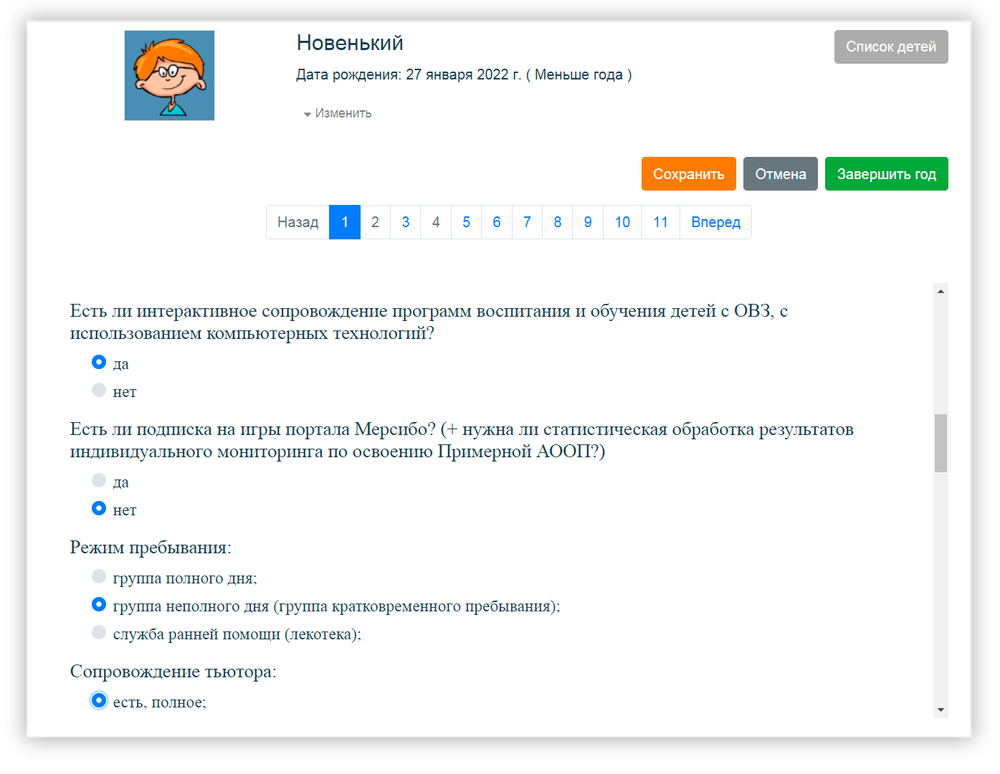 В начале работы выбираются основные характеристики: в какой группе занимается ребенок, какое заключение поставили в ПМПК, к какой категории ОВЗ относится ребенок и другие общие вопросы.