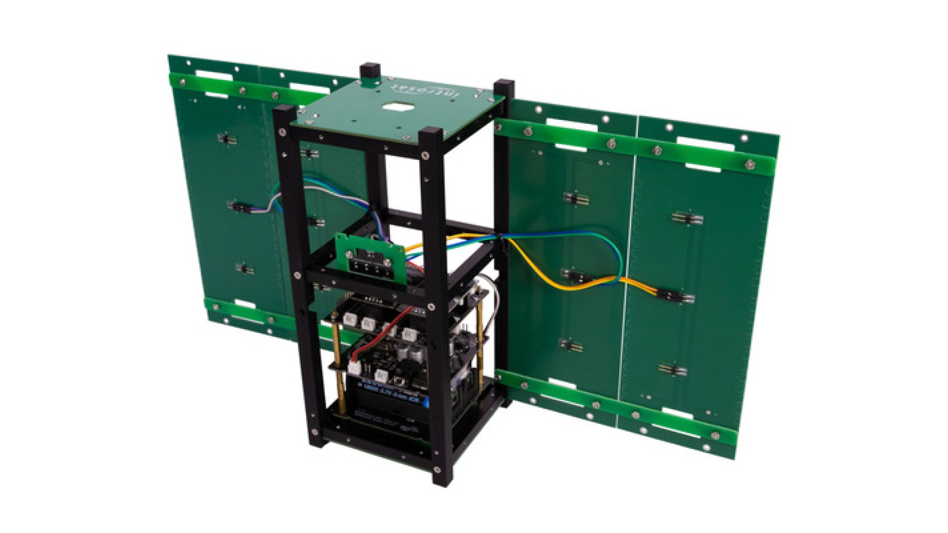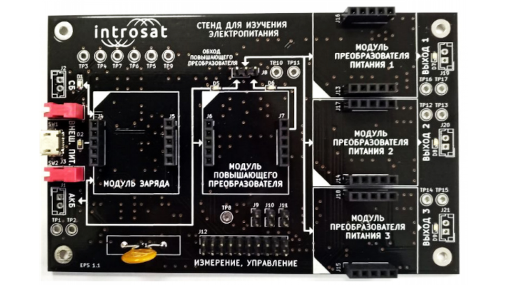 Комплект рельсов и корпусных панелей с солнечными батареями для аппарата ф/ф CubeSat 2U, Стенд управления питанием демонстрационный, Плата управления питания встраиваемая, Блок аккумуляторных батарей, Модуль контроля заряда, Модуль линейного стабилизатора, Модуль понижающего импульсного преобразователя 3,3 В, Модуль повышающего импульсного преобразователя 5В, Модуль преобразователя универсальный, Коннекторы для солнечных батарей, Модуль имитации работы от солнечных батарей на орбите с функциями имитации мощности солнечной батареи, соответствующей работе в околоземном пространстве (1400 Вт/м2) с учетом угла падения лучей от источника освещения и определения циклограммы работы системы питания с солнечных батарей по заданному алгоритму, Дополнительные компоненты для вводных практикумов, Крепеж, соединительные провода и разъемы