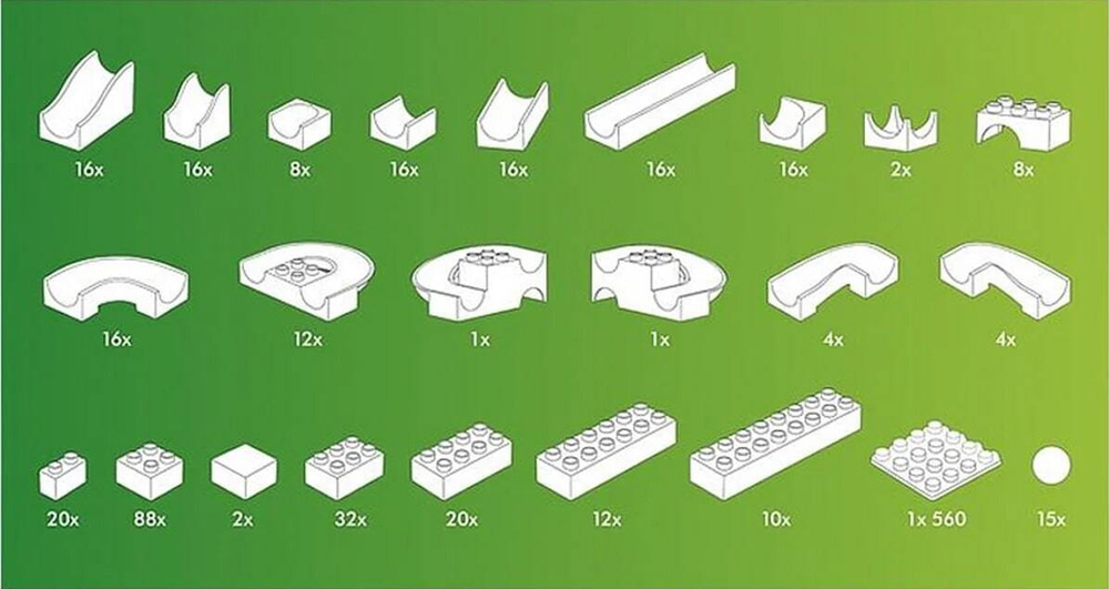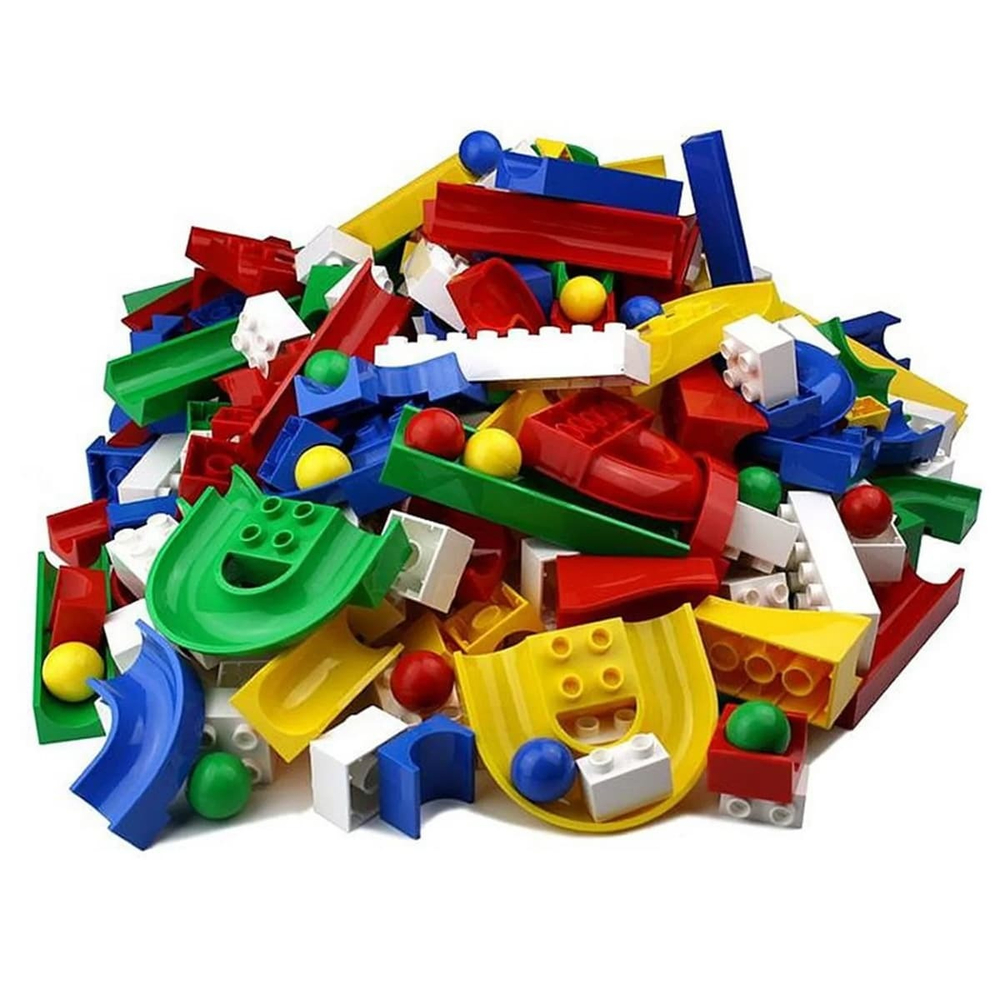 Большой набор строительных блоков и элементов для создания сложных трасс для шариков.