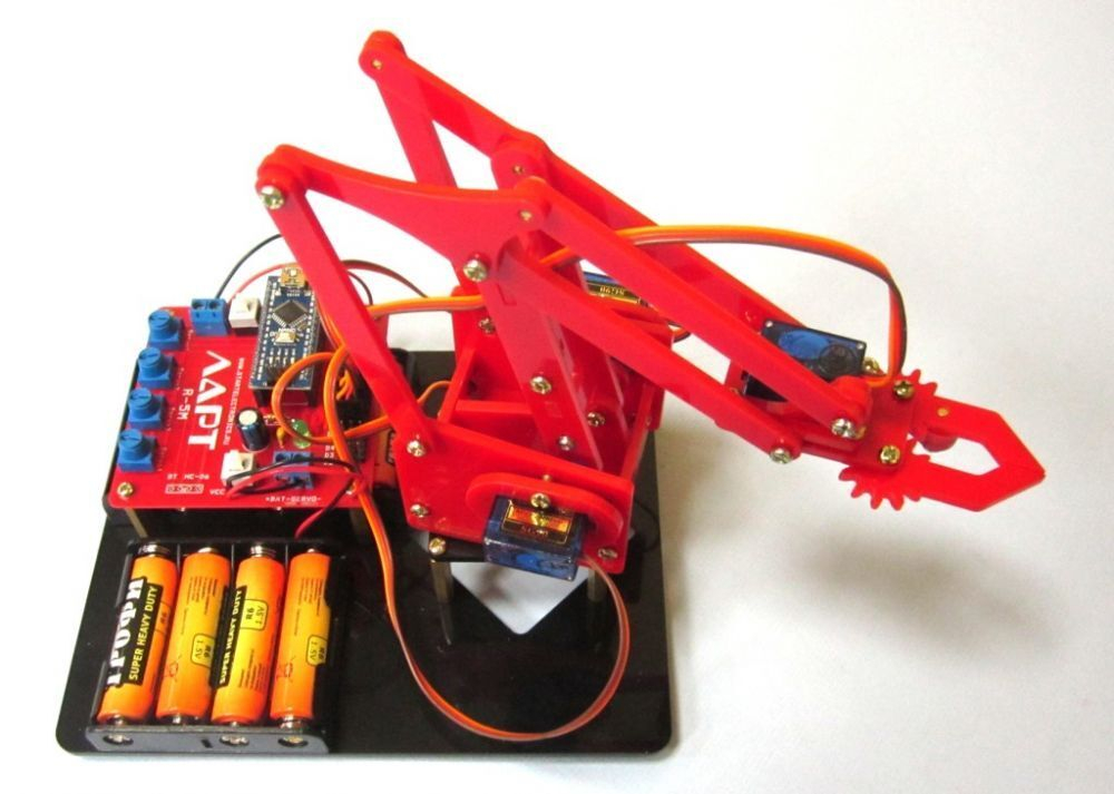 В комплект входят все необходимые компоненты для сборки вашей роботизированной руки, включая готовую печатную плату, четыре серводвигателя и плату управления. В комплект также входят пошаговые инструкции, которым легко следовать, что делает процесс сборки простым и понятный.