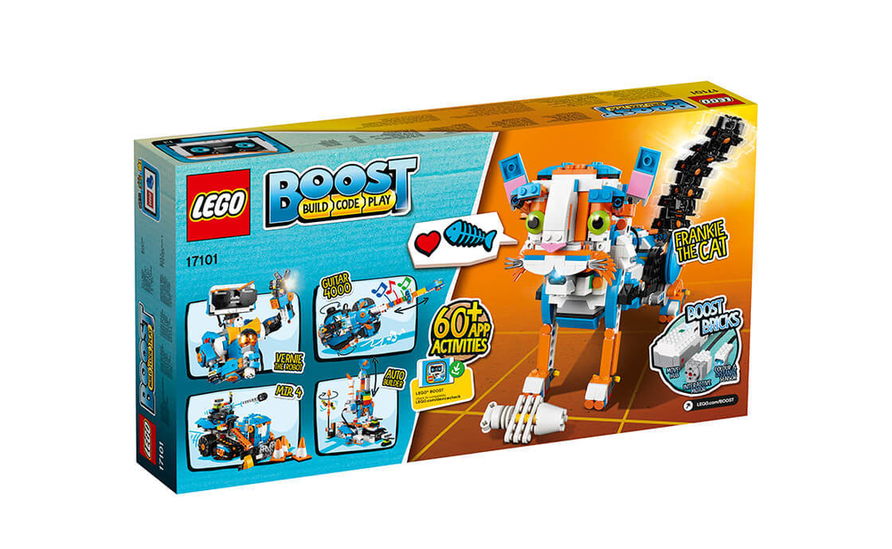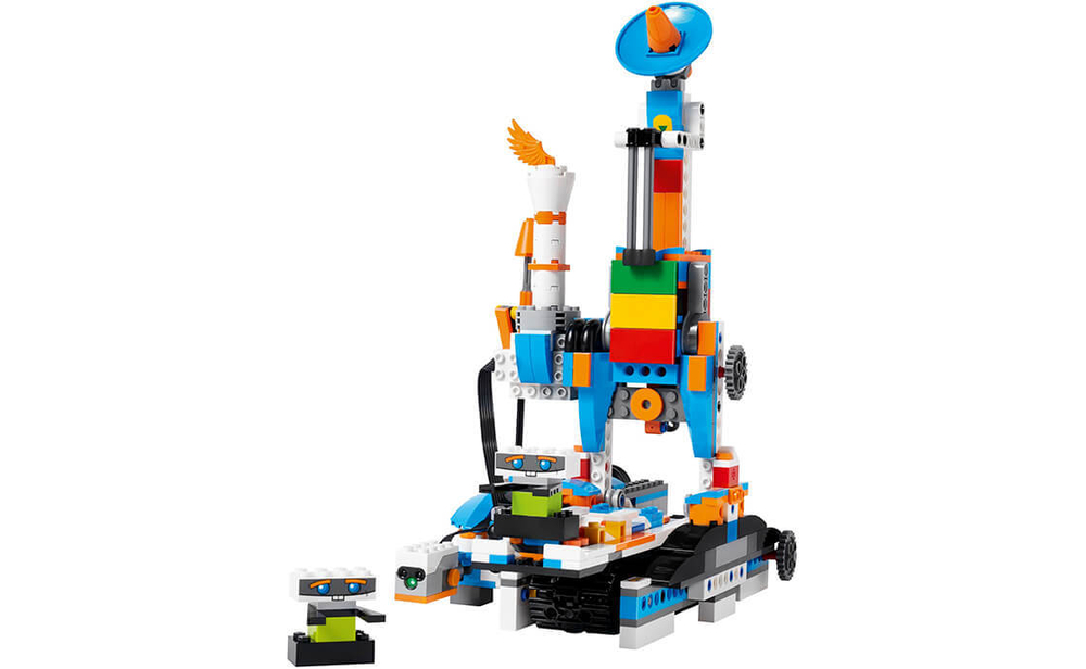 Получи новый опыт сборки с удивительным «Набором для конструирования и программирования LEGO® BOOST». Собери и настрой Верни – своего персонального говорящего друга-робота, запрограммируй его и выполняй забавные задания при помощи входящего в набор игрового коврика. Ты можешь обратиться к Верни с вопросом, и он ответит тебе с помощью мимики, которая точно точно отражает его настроение. Верни на своих широких гусеницах может двигаться в разных направлениях, менять скорость, различать объекты и цвета, определять расстояние, захватывать и переносить предметы, жестикулировать и метать дротики из пускового устройства, установленного на плече. Кроме того, Верни чувствует удары, может реагировать на них и понимает, когда вы поднимаете его в воздух. Из деталей робота легко собрать M.T.R.4 (Многофункциональный вездеход 4), Гитару 4000, Кота Фрэнки или Автомастерскую, управлять которыми можно с планшета при помощи бесплатного приложения, включающего в себя цифровые инструкции по сборке LEGO для всех 5 моделей, а также интересные задания и идеи для вдохновения.