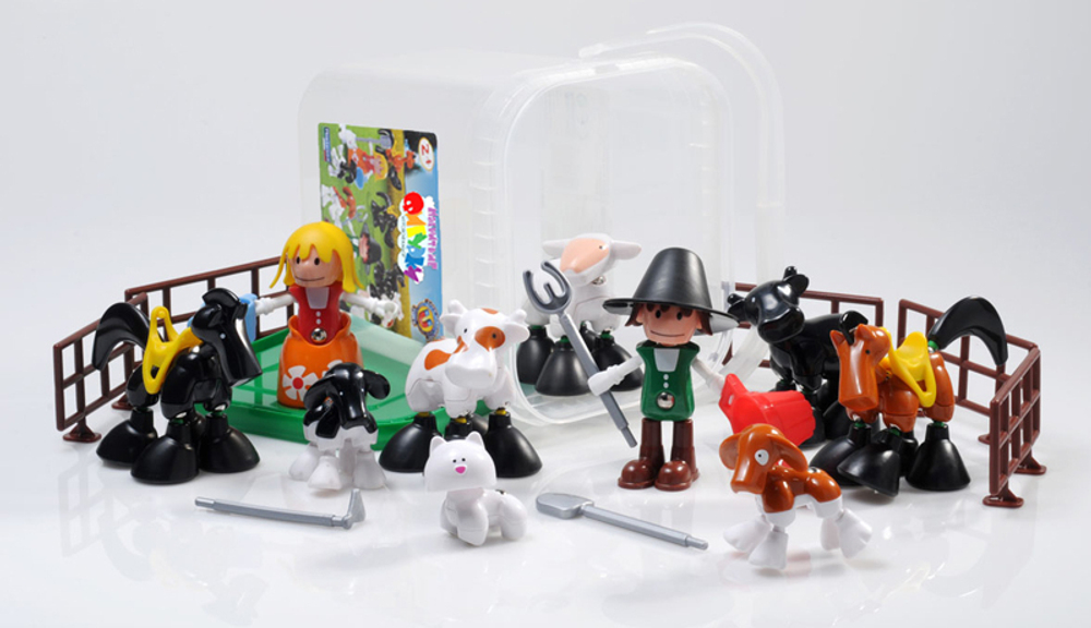 Оригинальный магнитный конструктор включает детали с магнитами, из которых можно составить подвижные фигурки людей и животных для сюжетной игры. Набор «Ферма» включает 58 деталей, из которых можно построить одновременно 10 фигурок для сюжетной игры: фермера и фермершу, двух лошадей, двух коров, овечку, поросенка, собаку и кошку. Кроме того, в набор входят некоторые дополнительные детали: седла для лошадей, 3 секции заборчика, лопата, вилы, мотыга, корзина и лейка, которые можно вставить в руки персонажей.