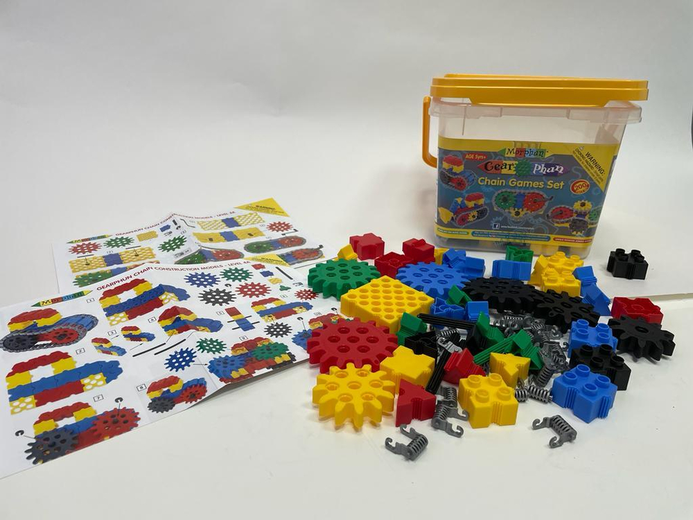 В состав комплекта включено большое количество шестерен 5-и разных размеров, набор для сборки цепной передачи, разноцветные детали 12 разных конфигураций, включая оси, фиксаторы, соединительные элементы разной формы, рукояти для вращения.