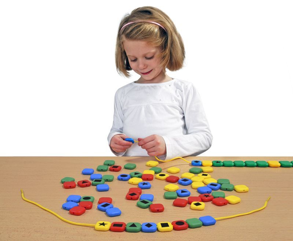 Играя с бусинами, ребенок учится координировать свои действия, развивает зрительно-моторную координацию и мелкую моторику рук. Нанесенные на бусины фигуры разной формы (круг, квадрат, треугольник, прямоугольник, ромб, звездочка) позволяют использовать набор для развития зрительного восприятия, различения основных геометрических форм, развития логического мышления (задания на сортировку и создание последовательностей по правилу). Кроме того, детали набора можно использовать для игр по физическому развитию при проведении оздоровительных игр и для коррекционной работы.