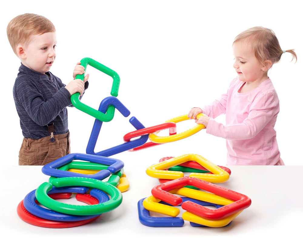 Набор состоит из цепочек, а точнее, из элементов, которые можно превратить в цепочку. Для этого потребуется ловкость рук и сообразительность. Детали соединяются без труда, с этим справится ребенок 2-х лет. Предметы в наборе могут стать частью игры ребенка и его друзей.