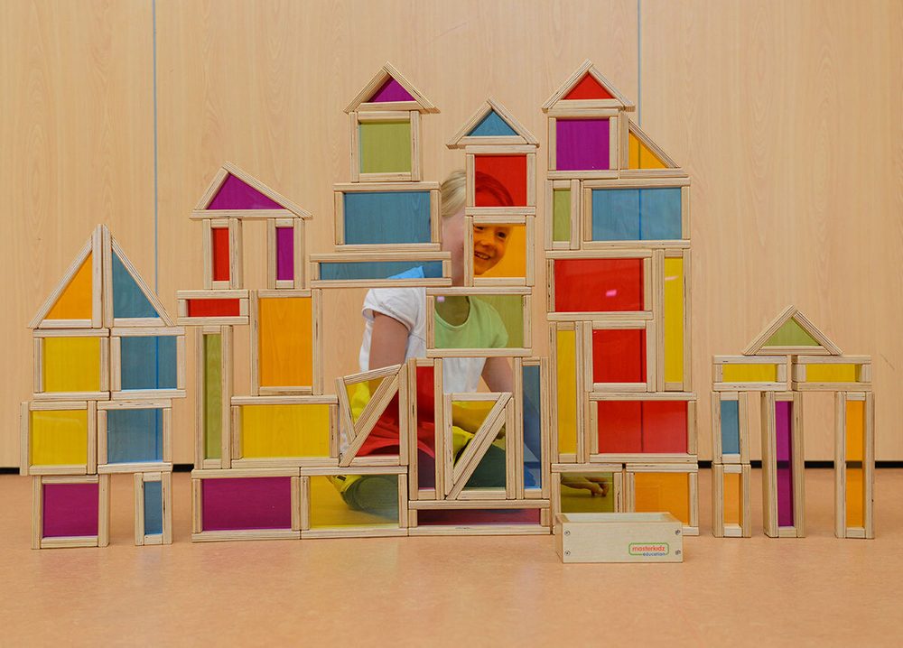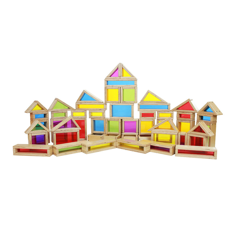 Набор из 51 массивного деревянного блока с разноцветными акриловыми стёклами.