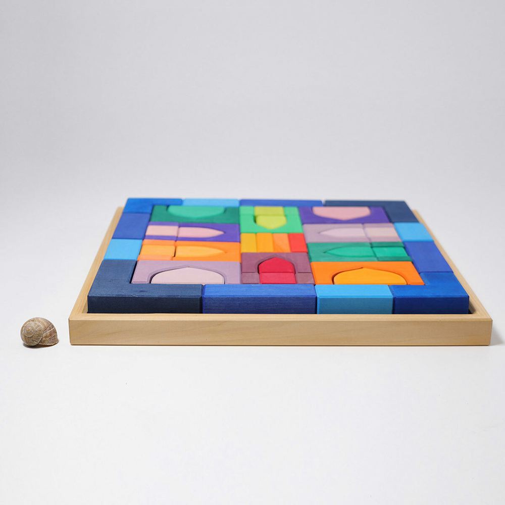 Набор состоит из 54 строительных блоков в деревянной раме.