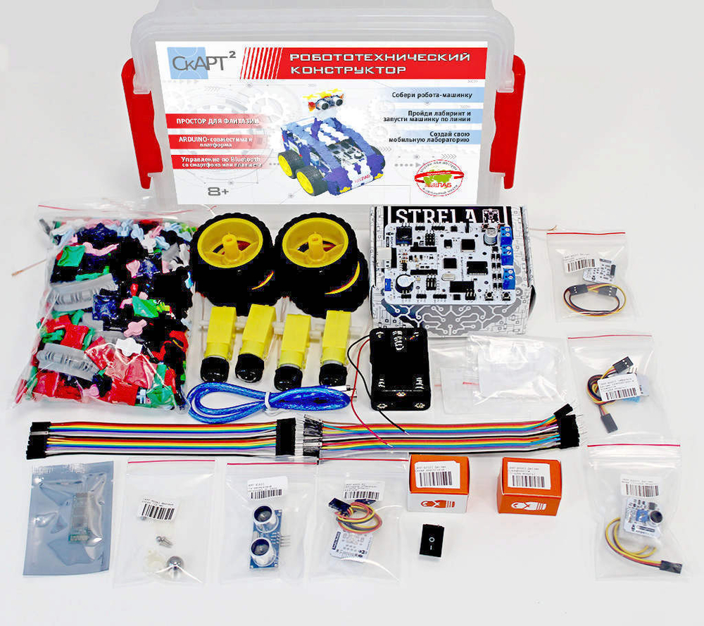 В дополнение к набору «СКАРТ-1» в наборе «СКАРТ-2», присутствуют датчики шума, температуры, влажности, освещенности и давления, что позволяет проводить с помощью собранного робота различные исследования. Входящих в набор комплектующих достаточно для того, что бы начать работу над собственным исследовательским проектом. Это может быть, например, мобильная исследовательская лаборатория. При этом, также, как и в наборе «СКАРТ-1», можно собрать робота для движения по линии или по лабиринту.