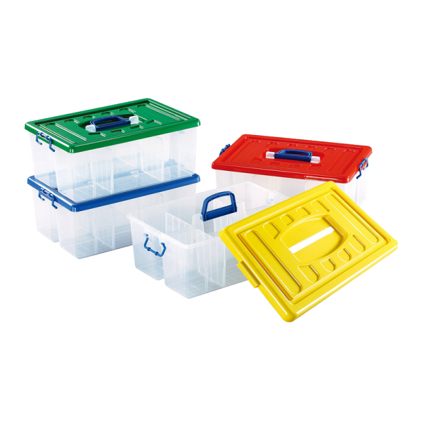 3 пластиковых контейнера с крышкой и ручкой, и дополнительными ручками-защелками.