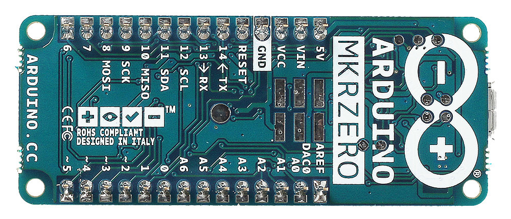 Внимание! Платформа выполнена на архитектуре ARM Cortex M0+, значит родное напряжение Arduino MKR Zero – 3,3 В. Выходы для логической единицы выдают 3,3 вольта и рассчитаны принимать не более того. Большее напряжение повредит микроконтроллер. Будьте внимательны при подключении периферии. Убедитесь, что она корректно работает в диапазоне до 3,3 В.