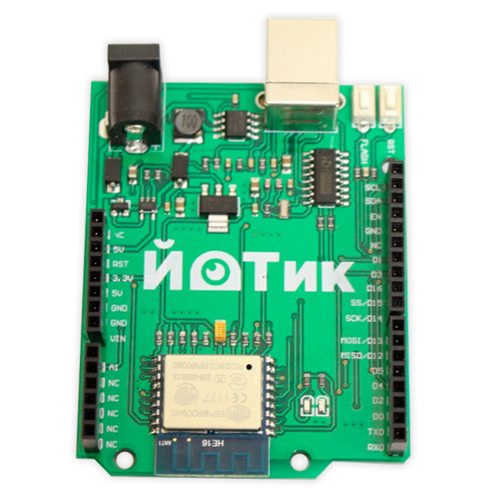 Контроллер ЙоТик – это Arduino-совместимый контроллер с Wi-Fi «на борту». Форм-фактор ЙоТик’а совпадает с форм-фактором Arduino UNO: совпадают размер платы, крепежные отверстия и расположение контактных разъемов. К контроллеру ЙоТик вы можете подключить различные Arduino-совместимые платы расширения.