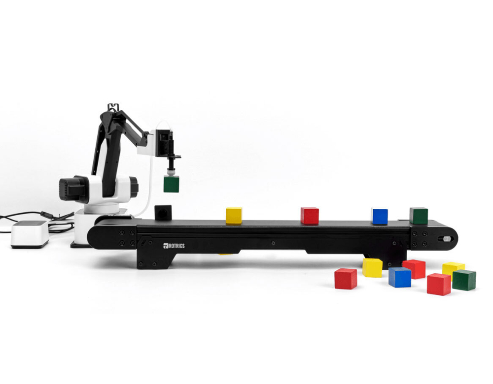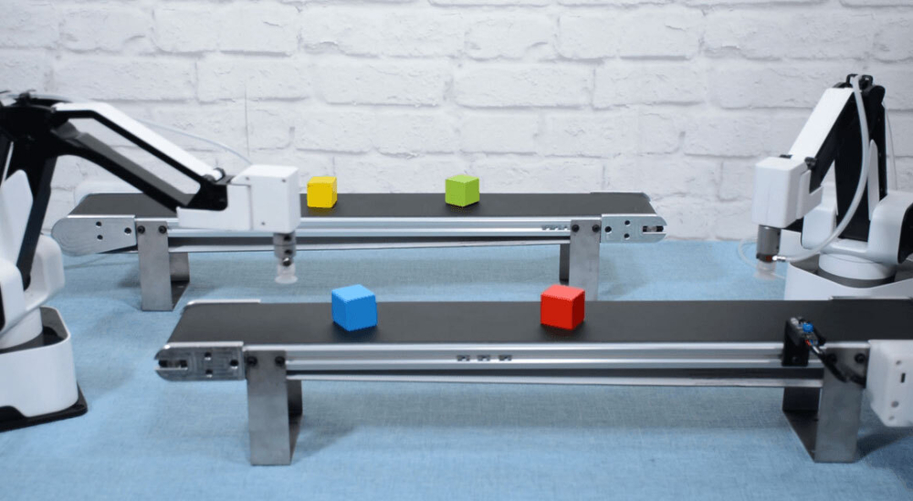 Конвейерная лента для четырёхосевого манипулятора - расширение стандартного набора. Позволяет создать полноценный мини конвейер прямо у вас на столе. Благодаря алюминиевому корпусу твердо стоит на ровной поверхности. Движение ленты двунаправленное, помимо самой ленты в комплекте идет камера и цветные кубики, данный набор делает возможным сортировку по цвету и моделирование промышленных задач.