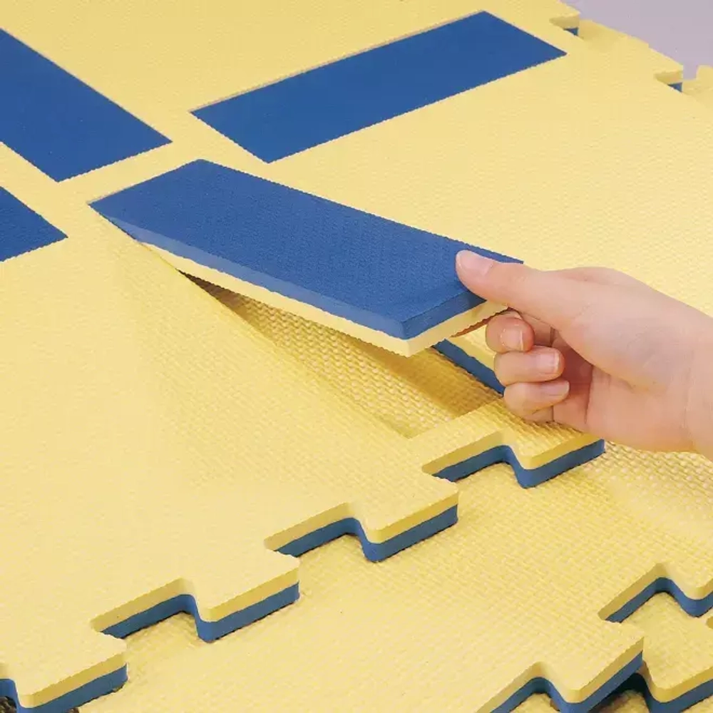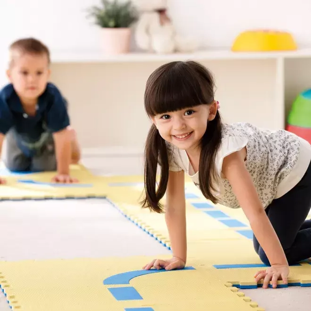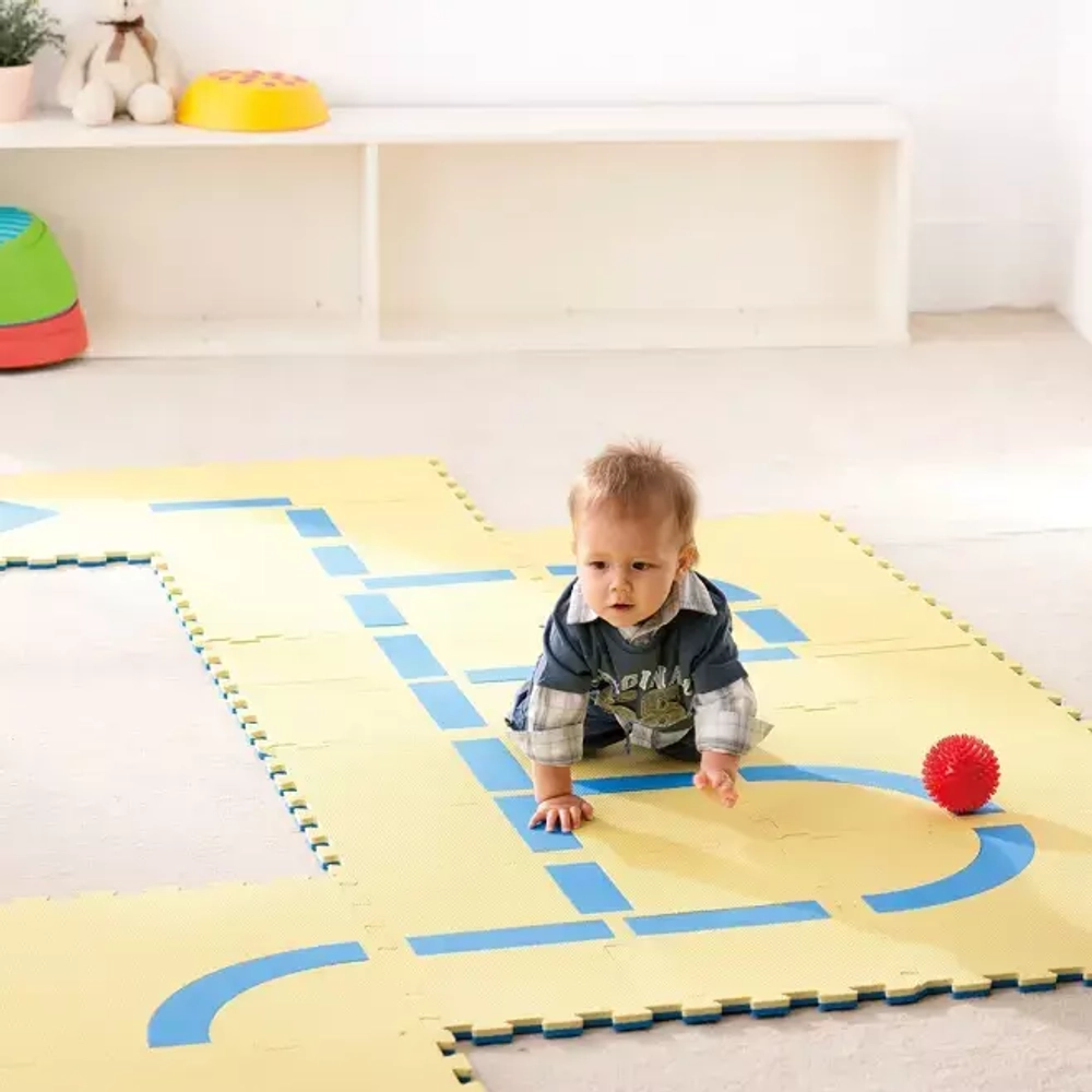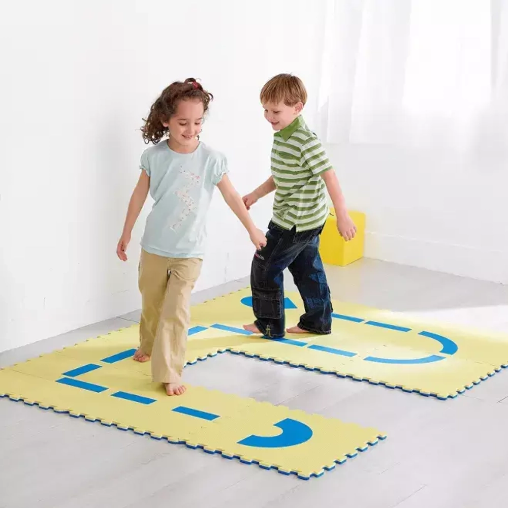 Коврик "Сложи тропинку" состоит из 12 соединяющихся между собой панелей из вспененного полимера со съемными элементами-вкладышами. Коврики двухсторонние контрастных цветов (голубой и желтый). Вкладыши можно вложить двумя способами: совпадающей с цветом коврика стороной (тогда он будет незаметен) и стороной контрастного цвета (тогда он будет заметен). Комбинируя способы размещения вкладышей и взаимное расположение ковриков, можно создавать "тропинки" различной конфигурации. Подходит для плоскостного конструирования и использования для развития основных движений, балансировки, мотивации занятий физкультурой.
