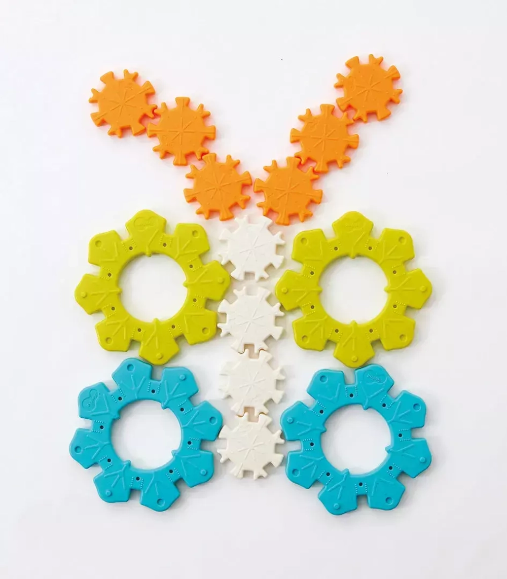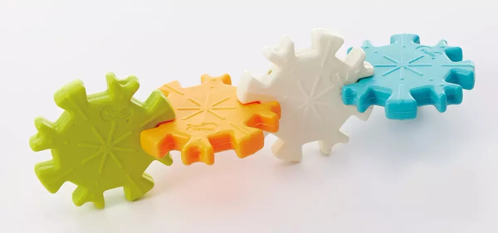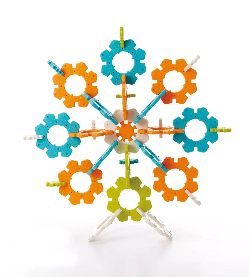 В комплект входят 56 блоков в форме снежинок голубого, зеленого, оранжевого и белого цветов. Для крепления друг с другом блоки имеют небольшие отверстия и выступы на поверхности и  сквозные прорези по краям. Маленькие "снежинки" можно поместить внутрь центрального круглого отверстия "большой" снежинки.
