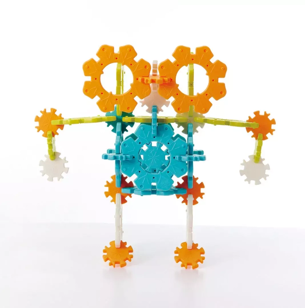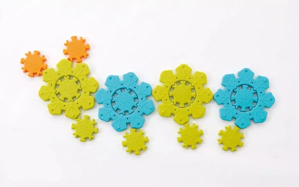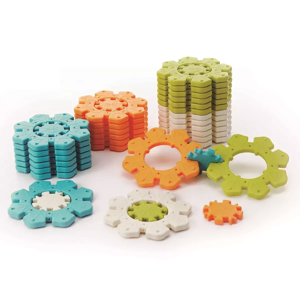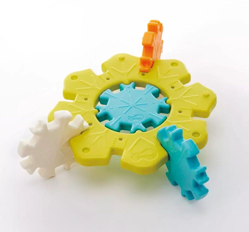 В комплект входят 56 блоков в форме снежинок голубого, зеленого, оранжевого и белого цветов. Для крепления друг с другом блоки имеют небольшие отверстия и выступы на поверхности и  сквозные прорези по краям. Маленькие "снежинки" можно поместить внутрь центрального круглого отверстия "большой" снежинки.