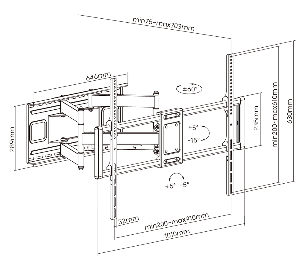 Невероятно мощный настенный выдвижной кронштейн Exell EXi-X9996-HD для панелей от 52 до 120 дюймов - потрясающее решение, которое не имеет аналогов на рынке. С его помощью вы сможете легко закрепить свою панель на стене и наслаждаться качественным изображением в любое время. Специально разработанные 2x2 колена и параметры VESA 900x600 мм позволяют закреплять практически все панели на рынке.