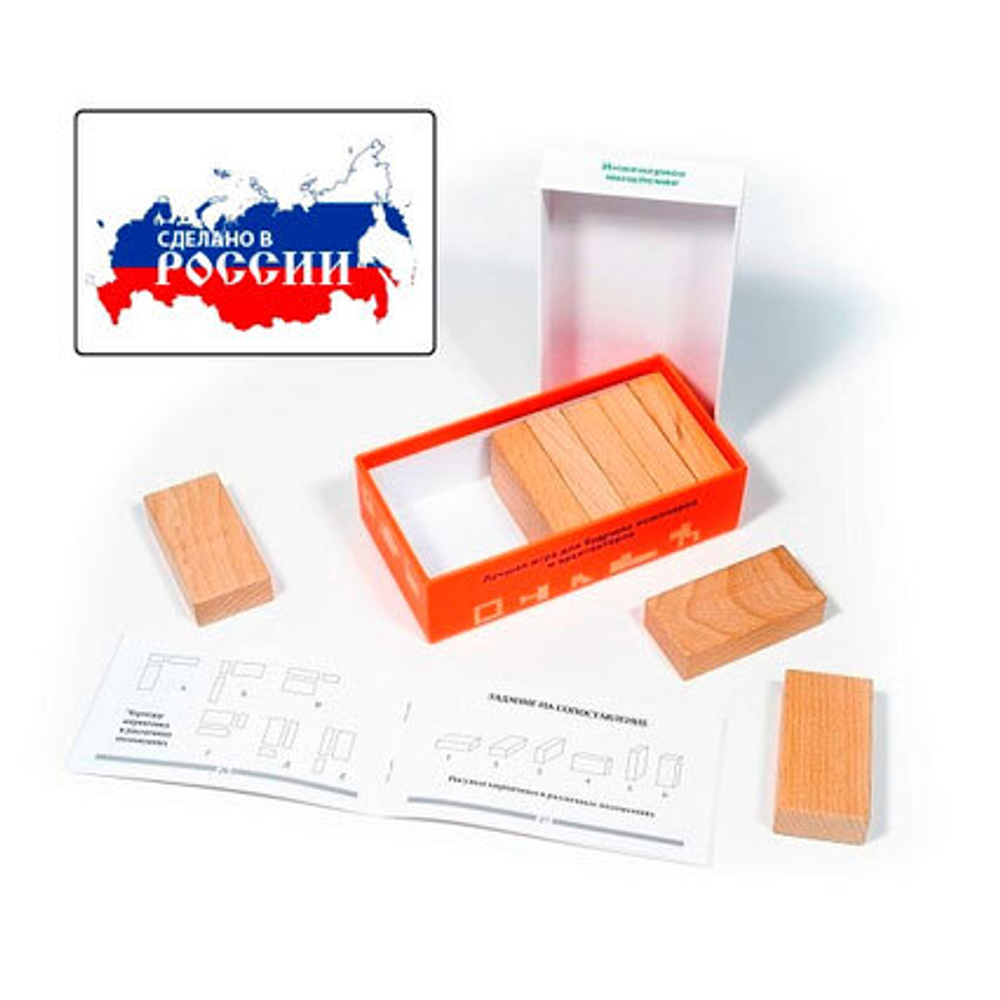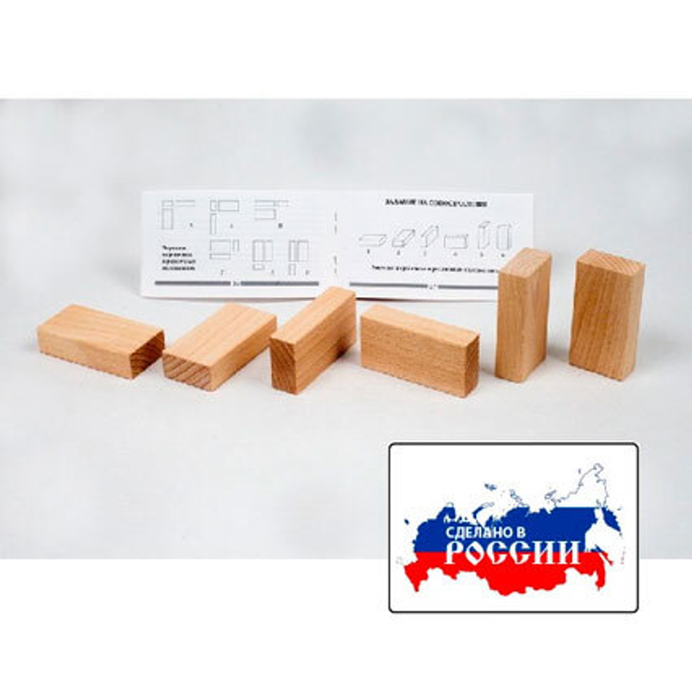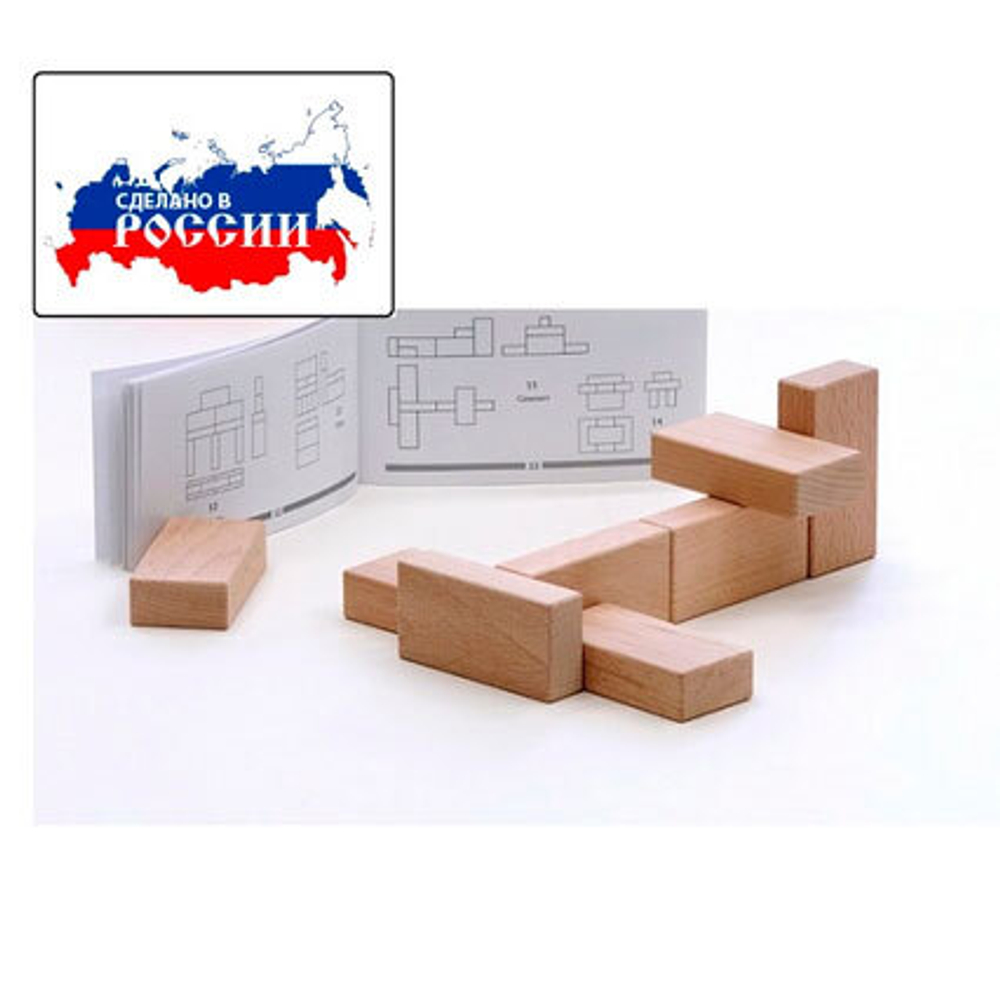 Игровое пособие состоит из 8 неокрашенных деревянных брусков, выполненных в форме кирпичиков, и блокнота с заданиями различной сложности.