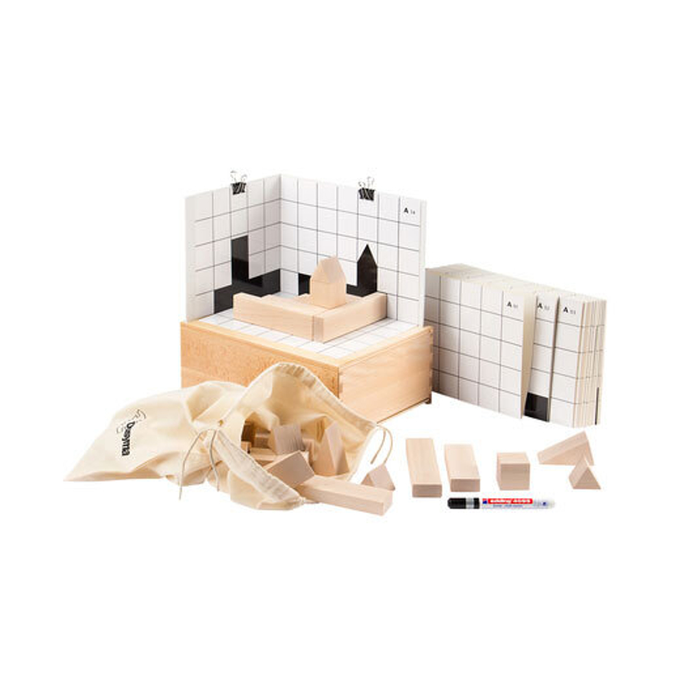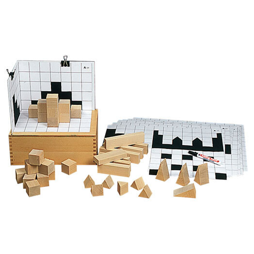 В комплекте 38 кубиков разной формы, 20 теневых шаблонов для построек, деревянная коробка для хранения.