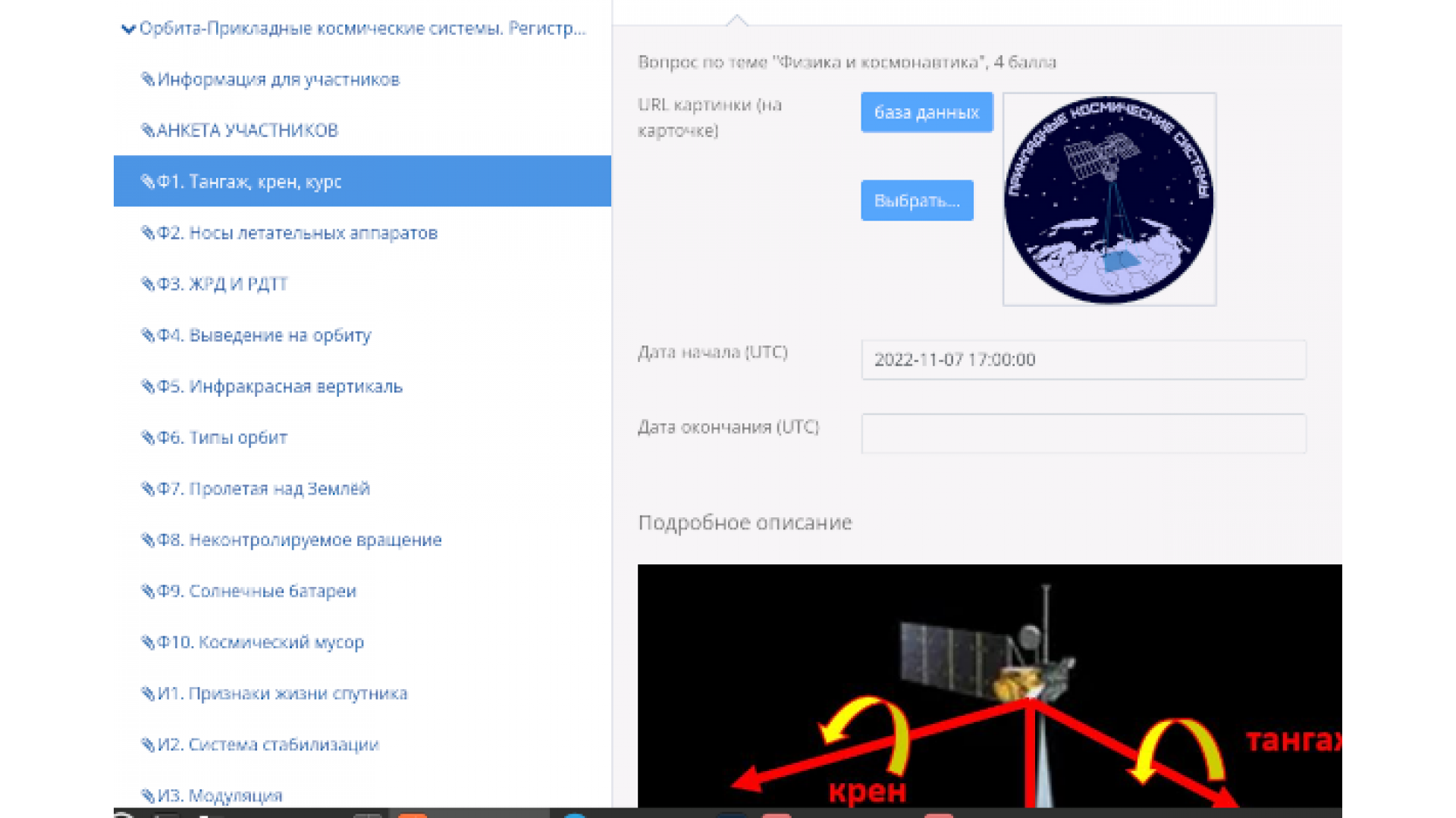 Функции программного обеспечения | Функция проектирования космических миссий, в т.ч. определение количества, конструкций, орбит и программ управления космических аппаратов, в т.ч. определение координат и параметров наземных станций, в т.ч. расчет результатов миссий в системе численного моделирования, в т.ч. возможность отображения графиков изменения объективных показателей миссии после ее расчета, в т.ч. возможность отображения положения аппаратов в течении миссии в 2Д- и 3Д- формате; Функция создания курсов задач и соревнований для учащихся, в т.ч. создания и изменения задач по проектированию космических миссий с настраиваемой и ручной оценкой результата симуляции миссии в т.ч. создания и изменения тестов с ответами в виде выбора значения, числа, строки с настраиваемой и ручной оценкой результата в т.ч. создания и изменения задач на разработку кода программ с настраиваемой и ручной оценкой результата Каталог материалов для преподавателя в т.ч. образцы задач для разработки курсов и соревнований, количество, шт в т.ч. наличие методических материалов в электронной форме для ведения занятий в области космической инженерии Управление доступом учащихся Формирование команд учащихся, учет индивидуального и командного результата |