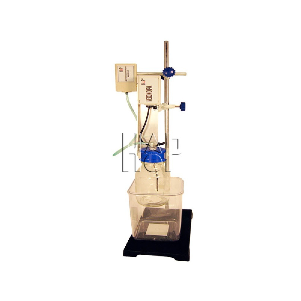 Герметичный стеклянный резервуар для газа смонтирован на вертикальной стойке таким образом, что он может быть погружен в стакан с горячей водой. Внутри резервуара с газом находится чувствительный элемент датчика температуры. Давление в резервуаре измеряется датчиком абсолютного давления, который устанавливается над резервуаром и соединяется с ним гибкой трубкой. Квазистационарные условия изохорного процесса обеспечиваются при остывании на воздухе предварительно нагретого резервуара, продолжающемся примерно 10 минут. Нагрев резервуара и, соответственно, находящегося в нем воздуха осуществляется при погружении его в горячую воду.