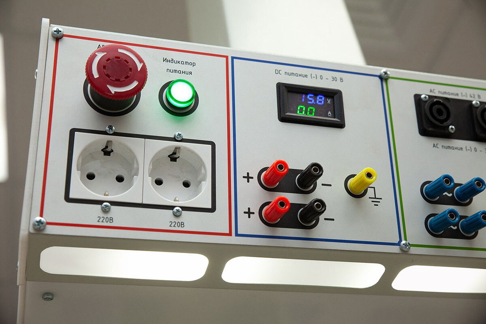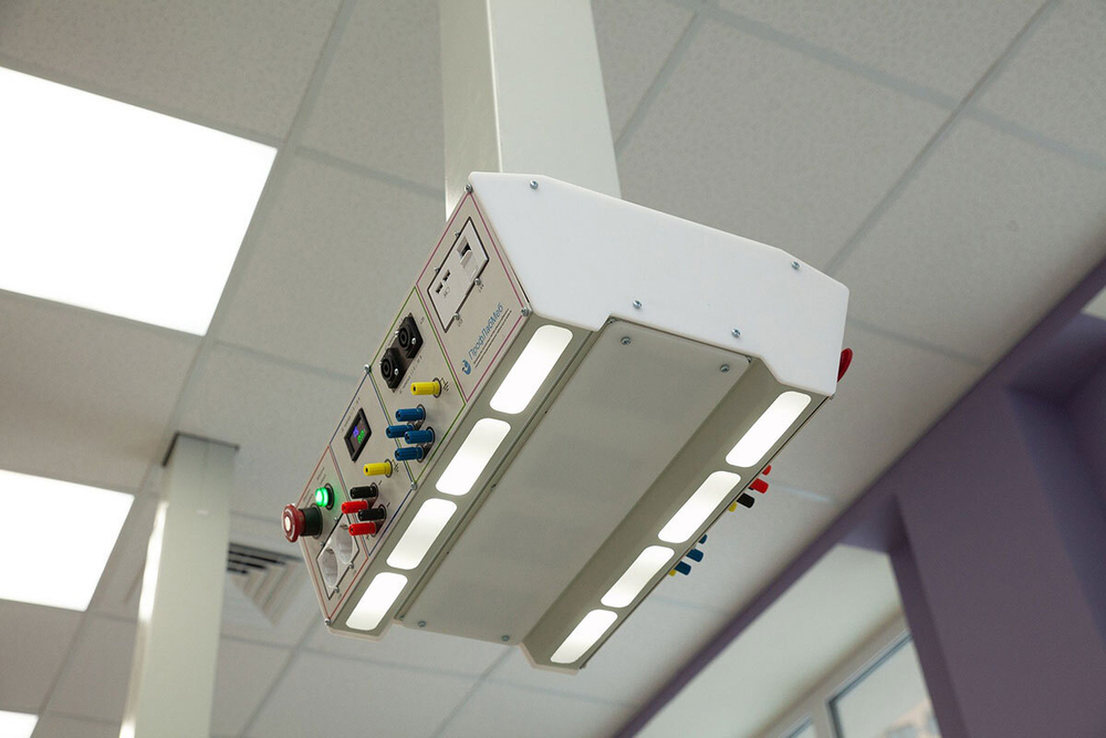 Устройство выдает постоянный и переменный ток для подачи его на потолочные модули электроснабжения учеников.
