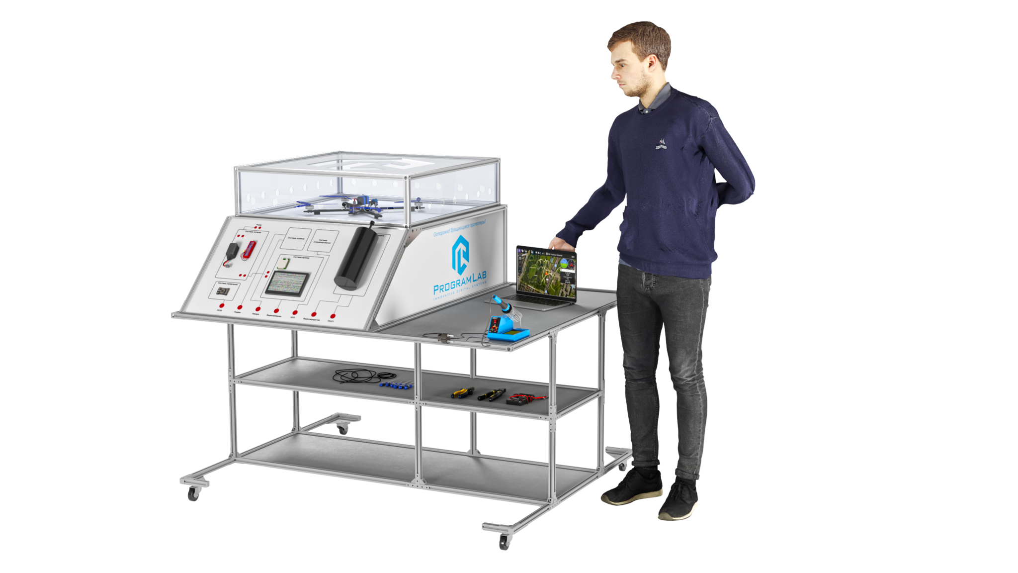 Лабораторный стенд представляет из себя учебный комплекс – рабочее место, предназначенный для подготовки специалистов по сборке, программированию и эксплуатации беспилотных летательных аппаратов FPV класса с оптоволоконным каналом связи. Комплекс позволяет получить базовые знания и навыки по устройству и сборке FPV-аппаратов, техническому обслуживанию, диагностике и устранению неисправностей, а также по программированию системы стабилизации дрона с помощью PID-регуляторов.