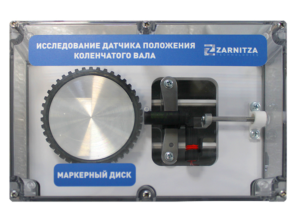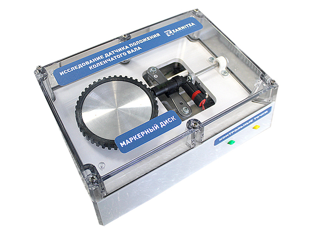 Лабораторный стенд-тренажер представляет собой пластиковый короб с прозрачной крышкой, в корпусе которого установлены: маркерный диск - имитатор шкива коленчатого вала, индуктивный датчик положения коленчатого вала, электродвигатель и приводной механизм, устройство, позволяющее изменять зазор между датчиком коленчатого вала и маркерным диском. Возможности стенда-тренажера позволяют наблюдать сигнал, генерируемый индуктивным датчиком коленчатого вала.