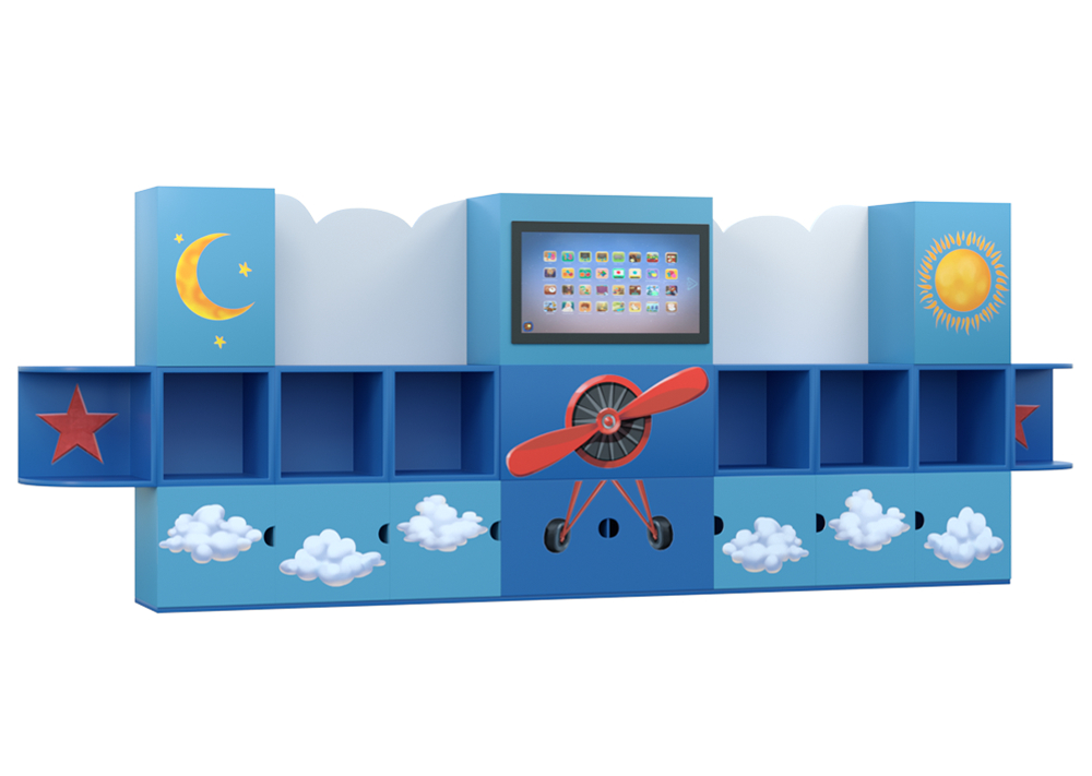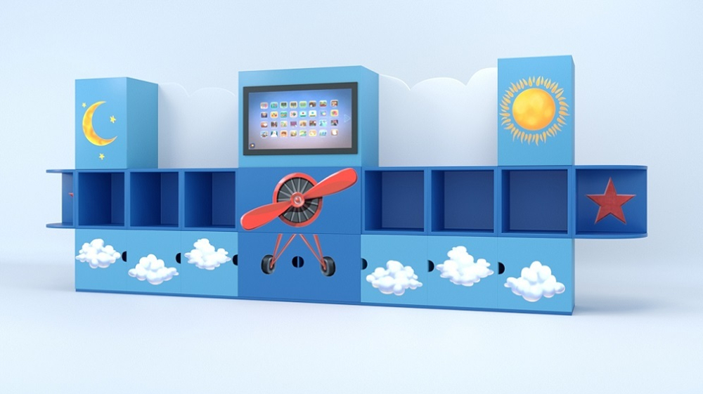 Продуманный до мелочей дизайн компактно вмещает в себя несколько игровых зон. На центральной части находится интерактивная панель со специализированным программным обеспечением. Удобные открытые книжные полки, скрытая от детского взгляда система хранения, соответствуют всем требованиям ФГОС.