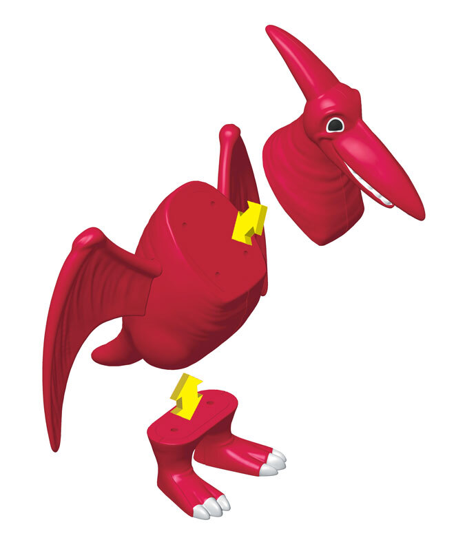 15 деталей - головы, туловища, по две пары ног у моделей анкилозавра, бронтозавра, птеродактиля и спинозавра.Применение магнитов в соответствующих местах позволяет соединять туловища с любыми головами и любыми двумя парами ног. Система магнитного соединения деталей по принципу папа-мама (гнездовая и штыревая части деталей конструктора, соединяются между собой за счет магнитного притяжения).