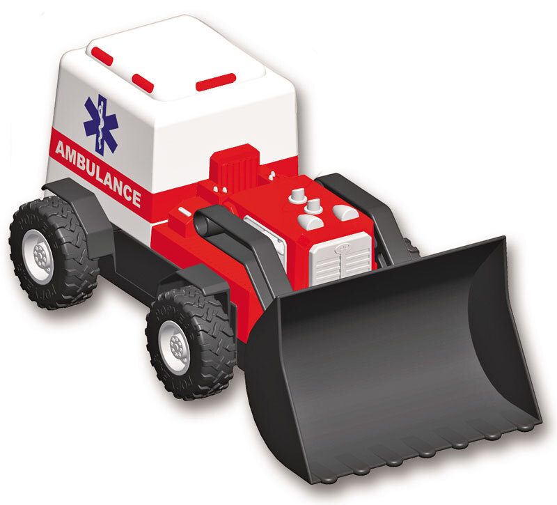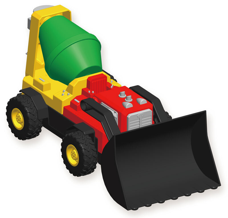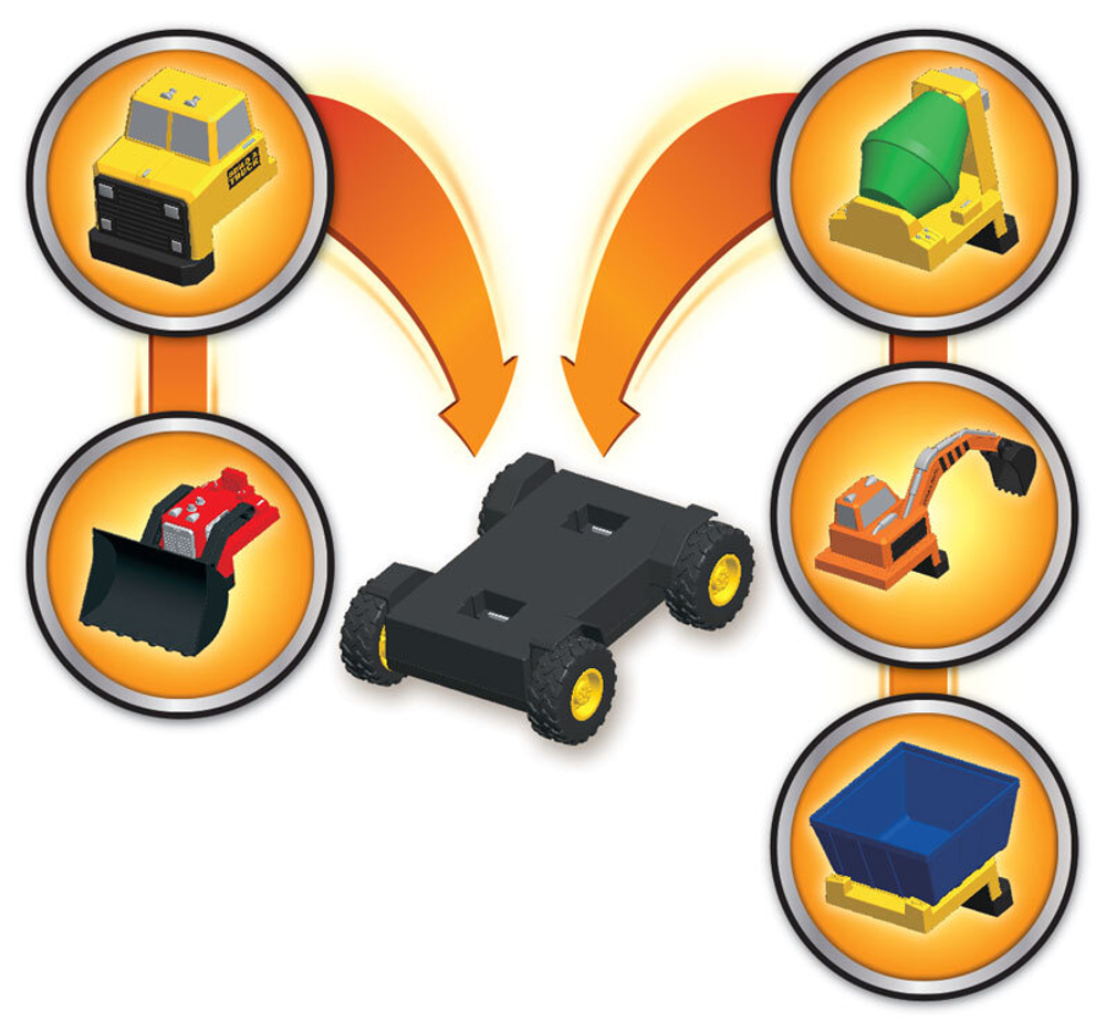 Колёсная база, кабина, бетономешалка, кузов, кабина экскаватора с ковшом, передняя часть бульдозера.