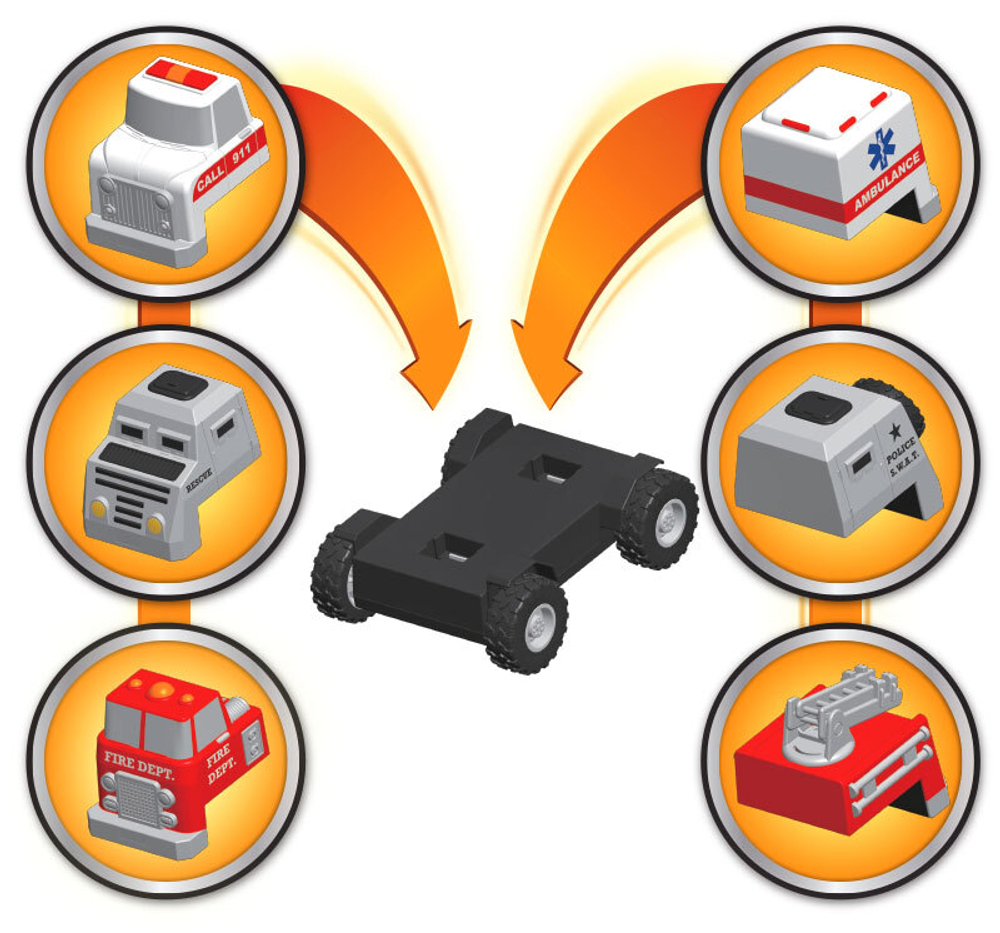 Колёсная база, кабина, пожарной машины, задняя часть пожарной машины с лестницей, кабина полицейского броневика, задняя часть броневика, передняя часть машины скорой помощи, задняя часть машины скорой помощи. Основные цвета: белый, красный, серый, черный.