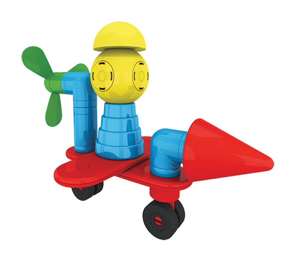 Состав набора включает 20 различных красочных конструкторских деталей, которые магнитно защелкиваются между собой, а при вращении соединенных деталей, создается эфект трещетки.