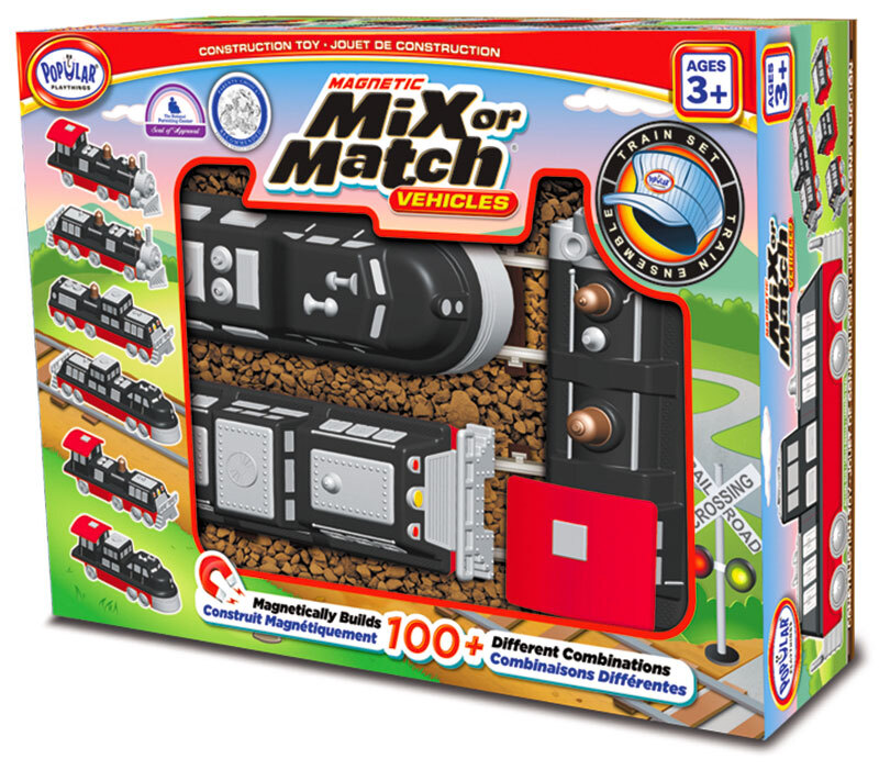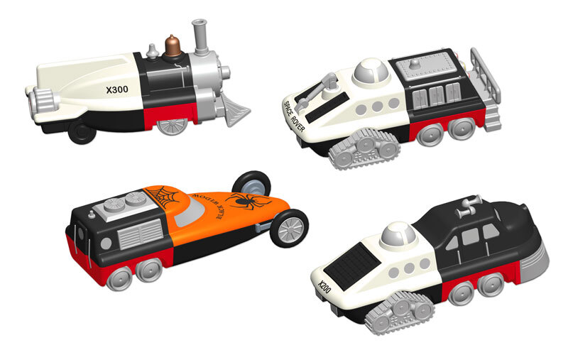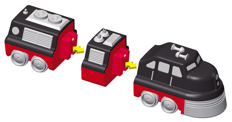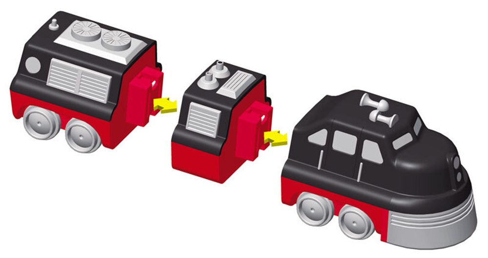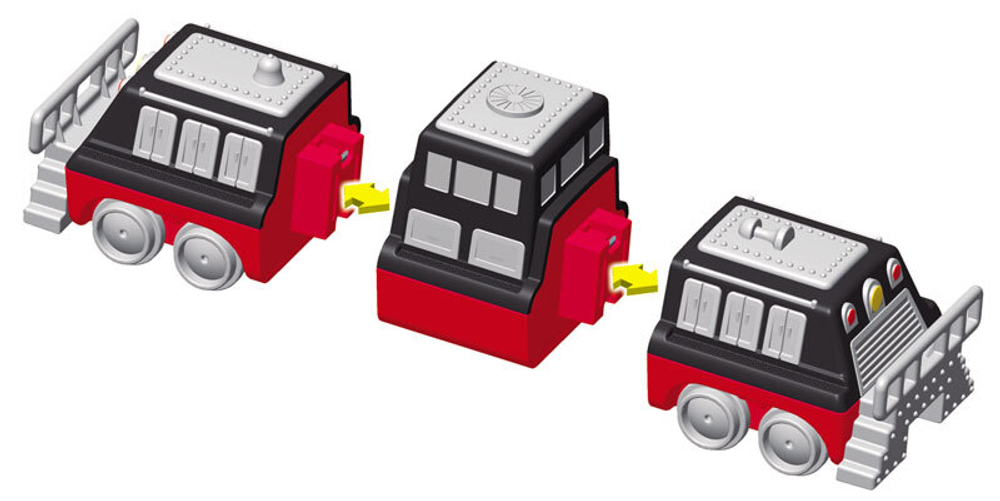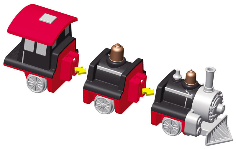 Тепловоз, паровоз, буксир состоящие каждый из трёх соединяемых с использованием магнита деталей. Используемые цвета на моделях: черный, серый, красный.
