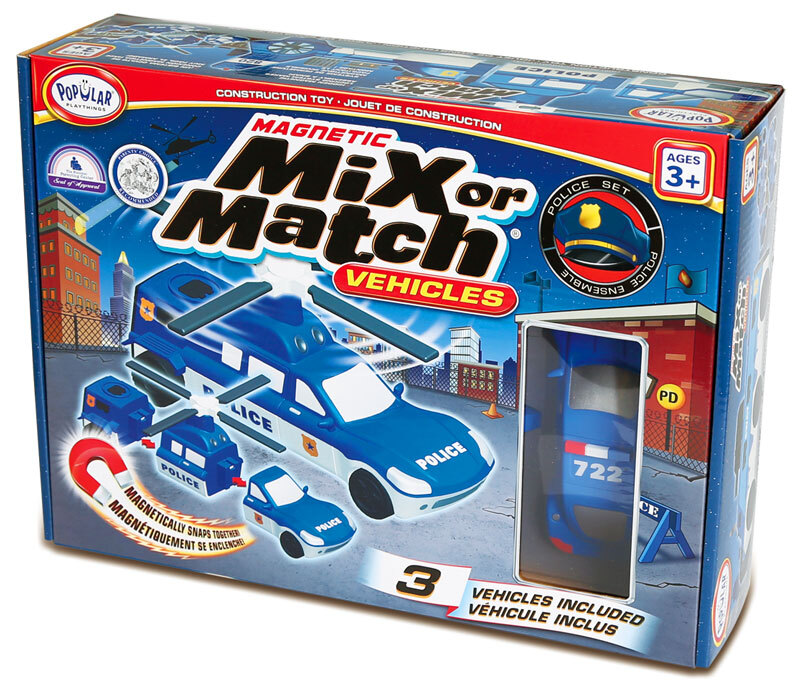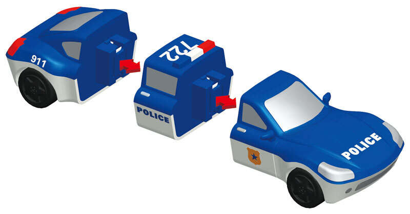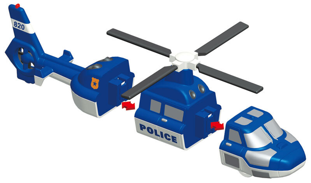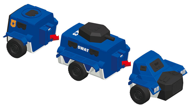 Броневик, полицейская машина, вертолёт, состоящие каждый из трёх соединяемых с использованием магнита деталей.